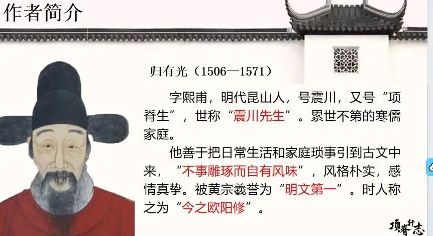 文学成就:他被誉为“明文第一”,开创“唐宋派”,主张“独出于胸臆”,写真感情。他的散文,往往于细微处见深情,于平淡中显功力。
