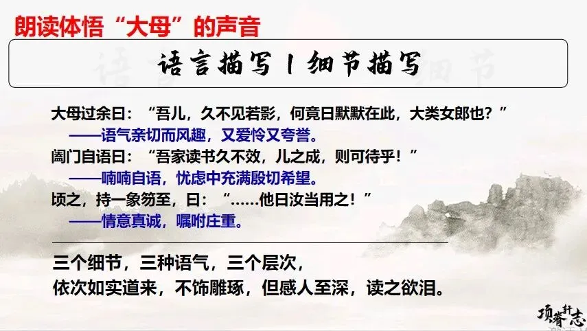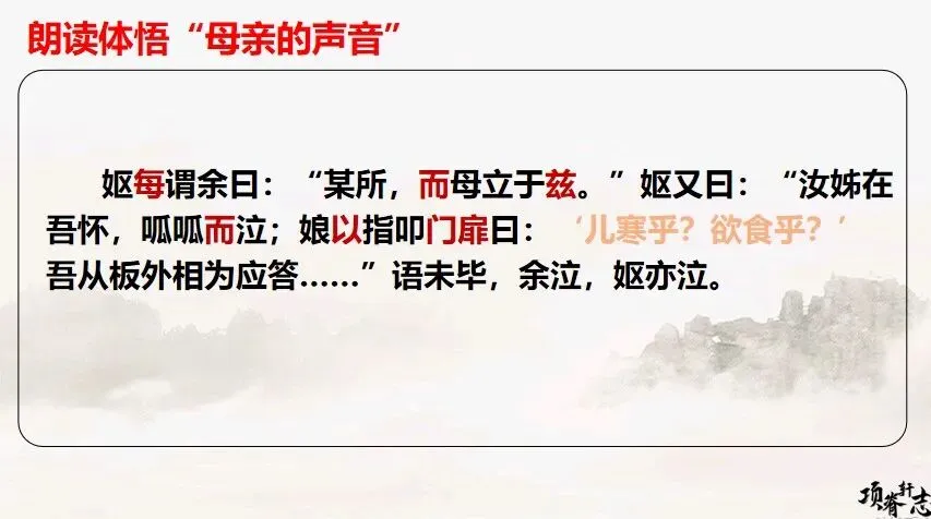 朗读指导:请大家轻声、缓慢地读“儿寒乎?欲食乎?”,试着读出那种穿越时空的、本能的、急切的关爱。(学生尝试朗读)2. 情感解码与想象提问:归有光对母亲的记忆,有什么特别之处?