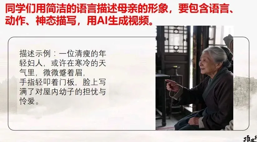 AI生成:根据学生的描述关键词(如“清瘦”、“蹙眉”、“叩门”、“担忧”),生成母亲立于门外的静态画面或简短动态场景。