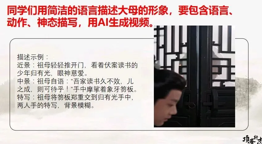 描述示例:近景:祖母轻轻推开门,看着伏案读书的少年归有光,眼神慈爱。