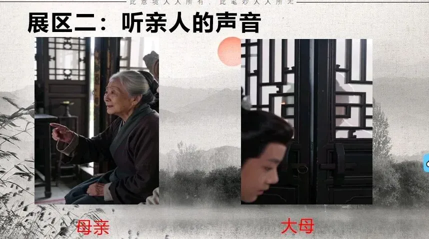 中景:祖母自语:“吾家读书久不效,儿之成,则可待乎!”手中摩挲着象牙笏板。