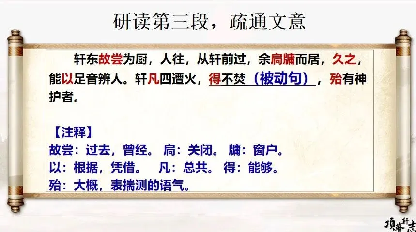 朗读体悟:请男生用苍老、缓慢、充满期盼的语气朗读祖母的话,女生读后面归有光“瞻顾遗迹,令人长号不自禁”,体会那哭声中的愧疚、压力与追悔。