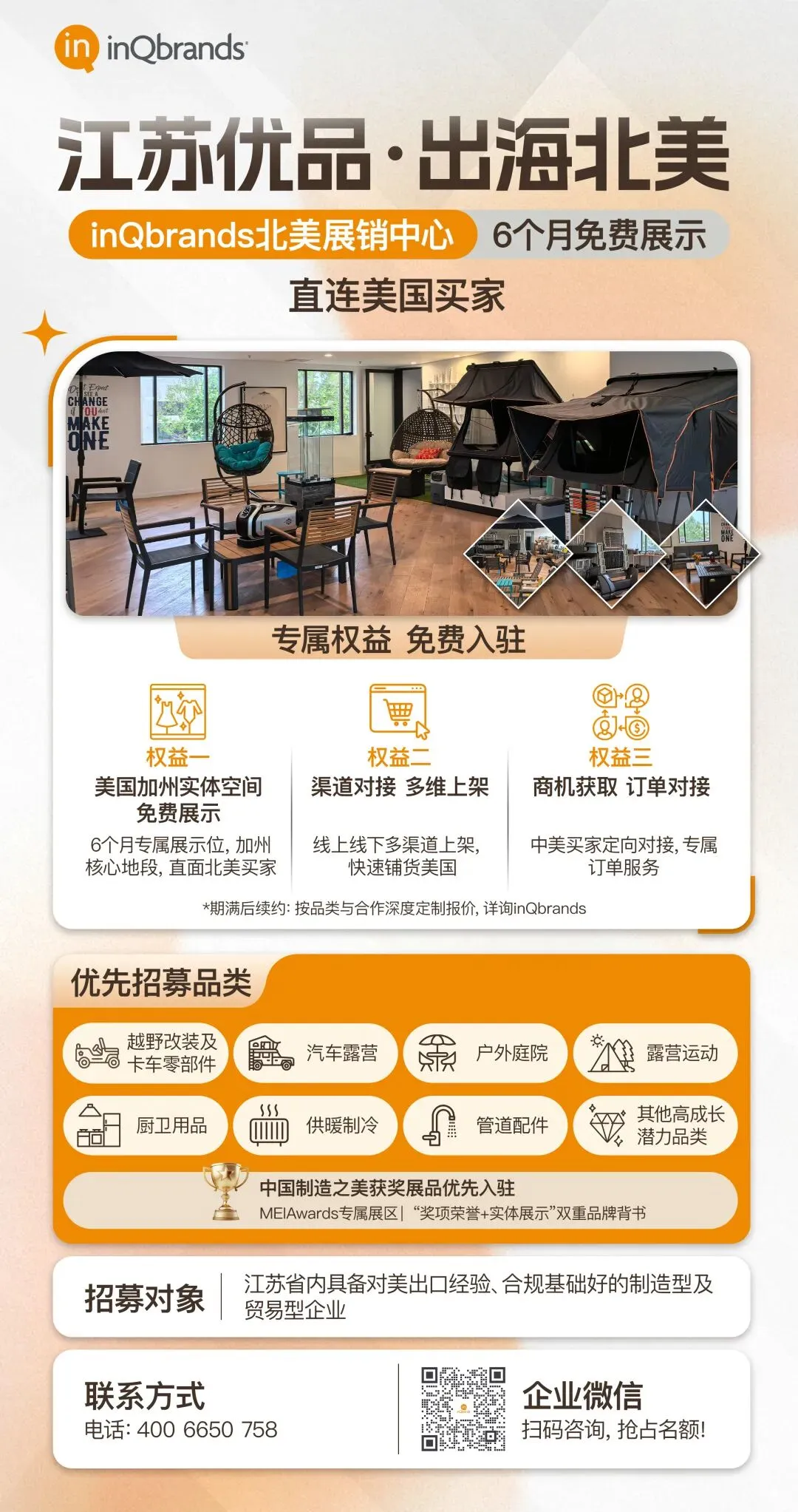 当下出海,单兵作战成本高、效率低。inQbrands旨在联合江苏优秀企业打造一个 “市场运作、企业主体、本土曝光” 的北美前置化支点。