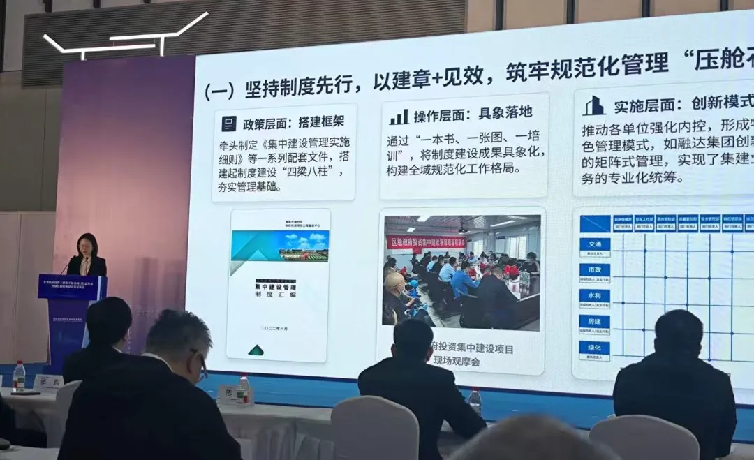 会议重点介绍金沙湾医学综合体(一期)建设项目,充分肯定项目在绿色建造、规范化管理、智能施工等方面的突出成效。近年来,通州区坚持以绿色发展为导向,构建全流程闭环监管体系,率先推行高星级绿色建筑标准,全面应用绿色建材认证产品,持续推动建筑领域低碳转型。融达集团积极响应政策要求,创新采用矩阵式管理模式,以专业化、高效化统筹推进政府投资集中建设项目,为项目高质量落地提供坚实保障。