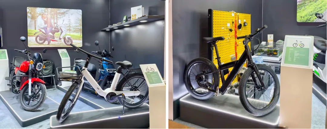 在电助力自行车系列中,中锦公司重点展示了两款产品,主打城市通勤场景,整车采用铝合金一体压铸车架和无链传动系统,轻便灵巧、简洁时尚。搭载电池续航里程长,电机功率符合足欧盟及北美市场法规。车型还适配传感器和隐藏式链条设计,既能保留骑行乐趣又能提供电力辅助,方便都市女性及青少年用户满足日常通勤和休闲出行需求。