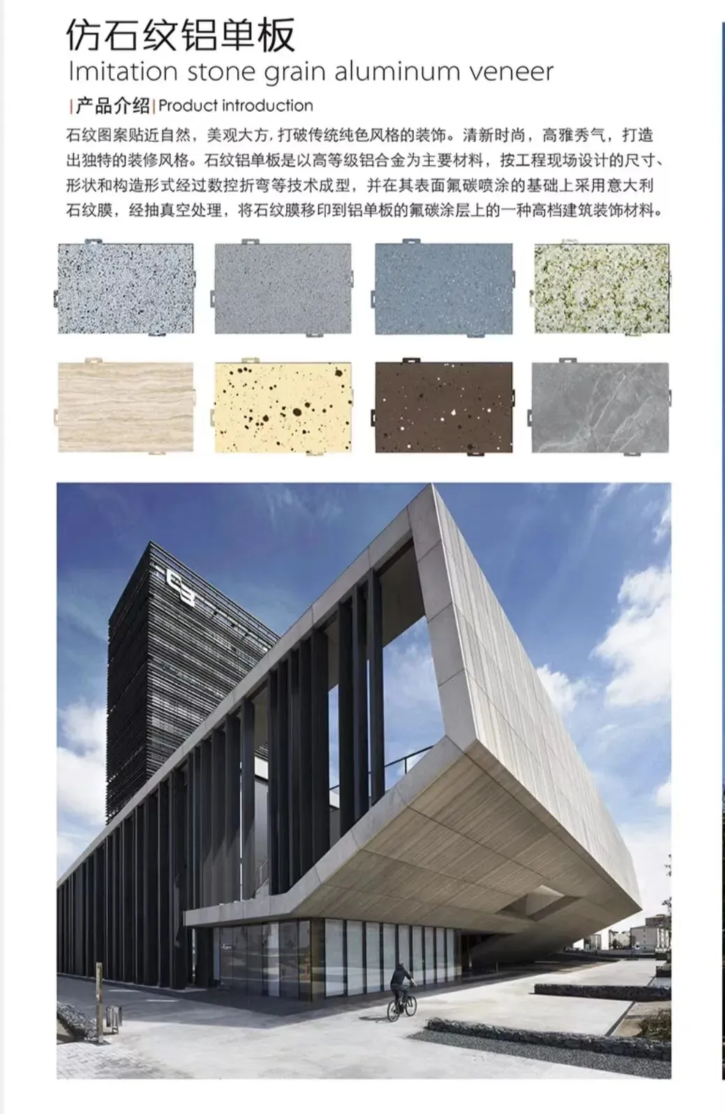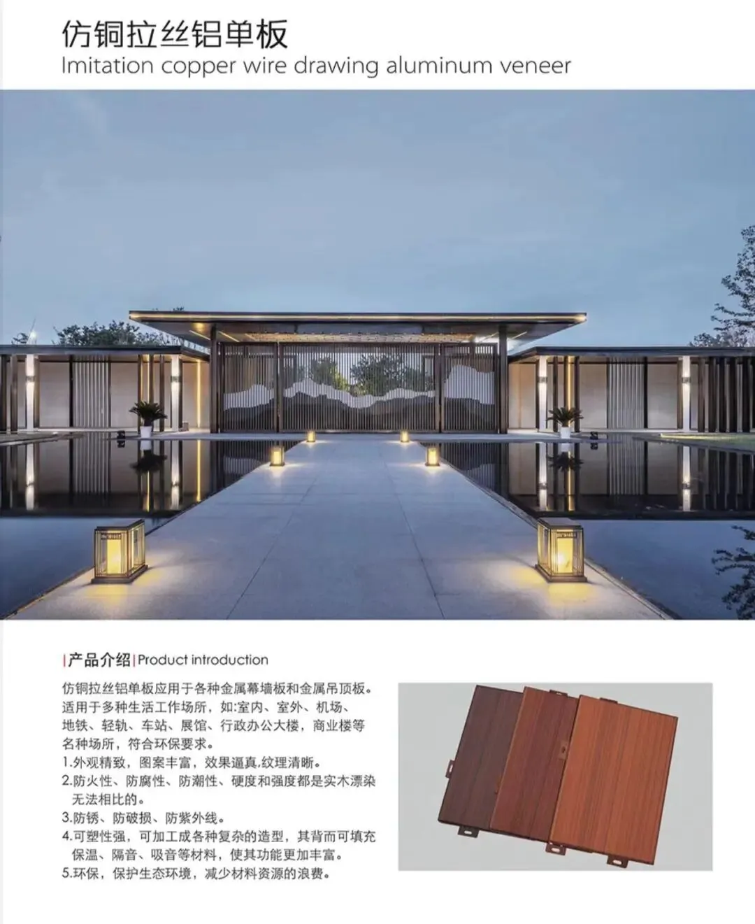 潍坊坚铭新材料科技有限公司,是一家专业为房地产客户提供一体化配套产品和服务的综合性集团公司。主营业务板块:幕墙铝单板、铝天花板、冲孔铝板、木纹转印铝板、真铜漆拉丝铝板、景墙格栅及表面真铜漆拉丝、氟碳、粉末、仿石材、水包水喷涂等多种表面处理加工的铝板及铝材等一系列加工制作。