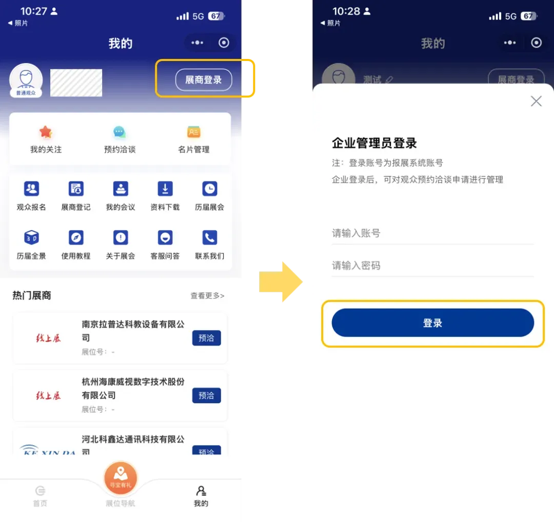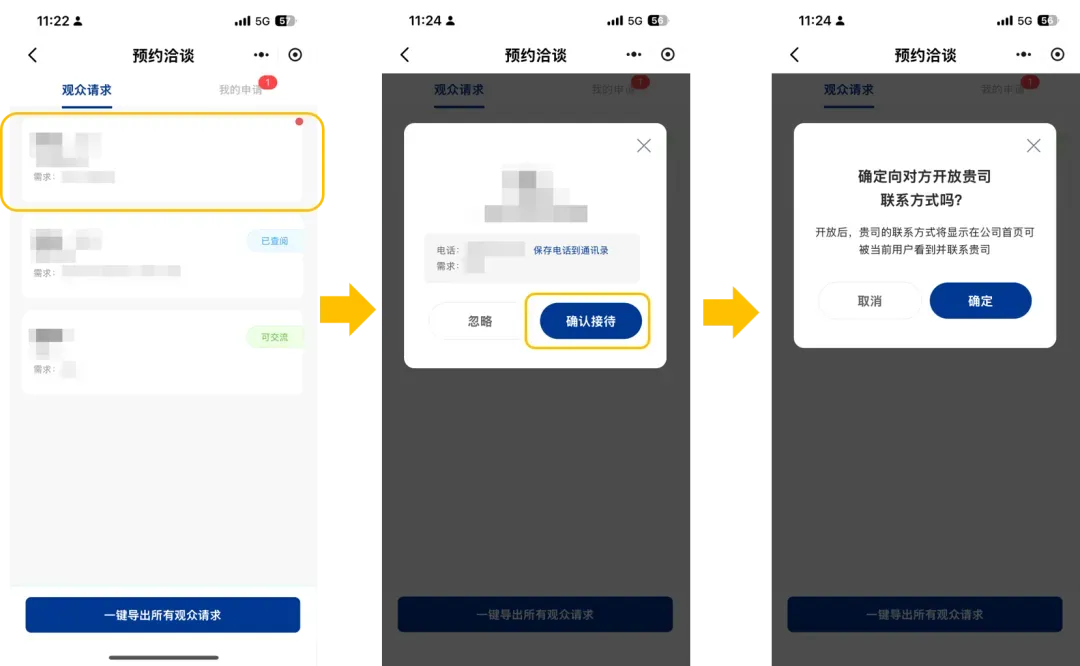 为避免骚扰,展商的联系方式,默认不对观众开放,展商可在小程序【我的】-【预约洽谈】中一键审核,联系方式可定向开放,防骚扰。