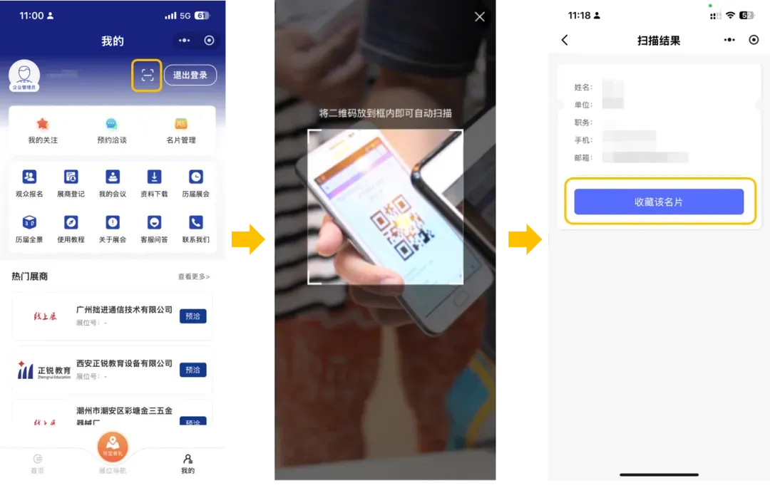 同样的,展商也可通过线上展小程序的扫一扫功能,扫观众证件上的参观码,收集观众名片。