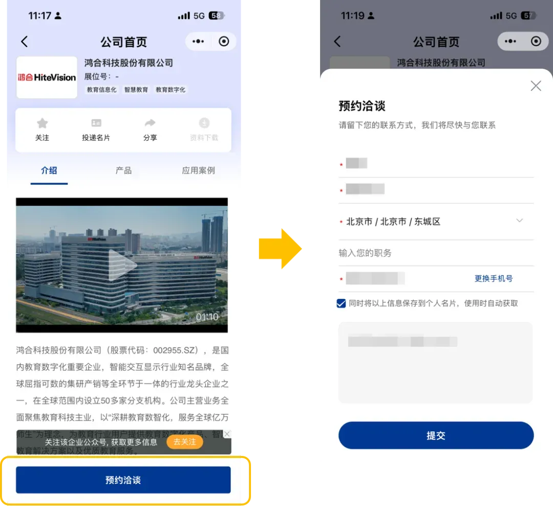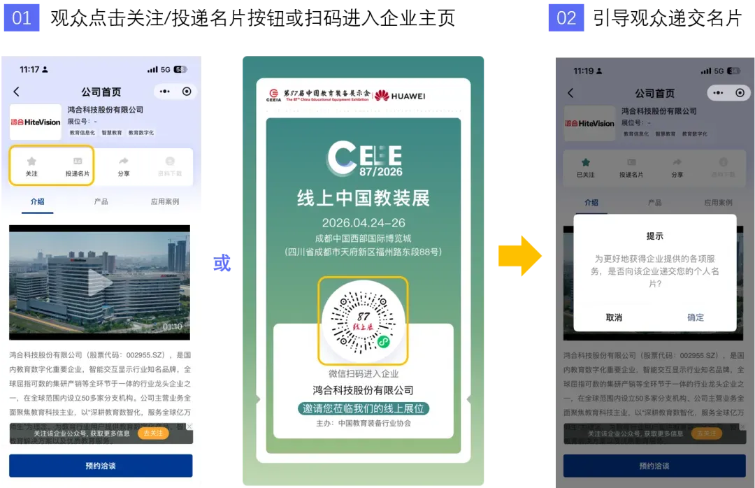 展会筹备预热阶段,展商可分享企业主页给观众。当观众打开企业主页,即可通过界面引导向展商投递名片。