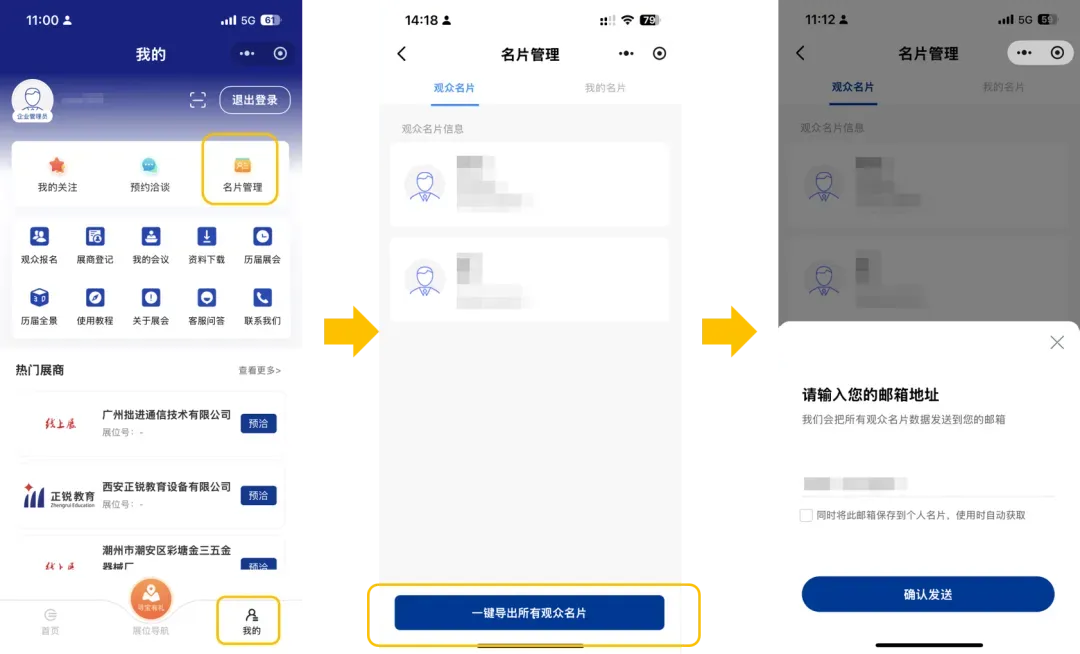 登录小程序后,展商管理员可在【我的】-【名片管理】中,点击【一键导出所有观众名片】,以邮件形式下载名片清单。