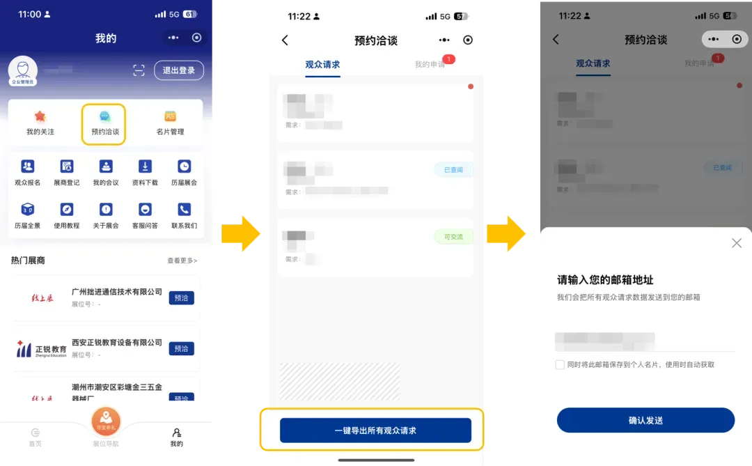 展商管理员登录小程序后,在【我的】-【预约洽谈】中,点击【一键导出所有观众请求】,可以邮件形式下载所有预约洽谈清单。