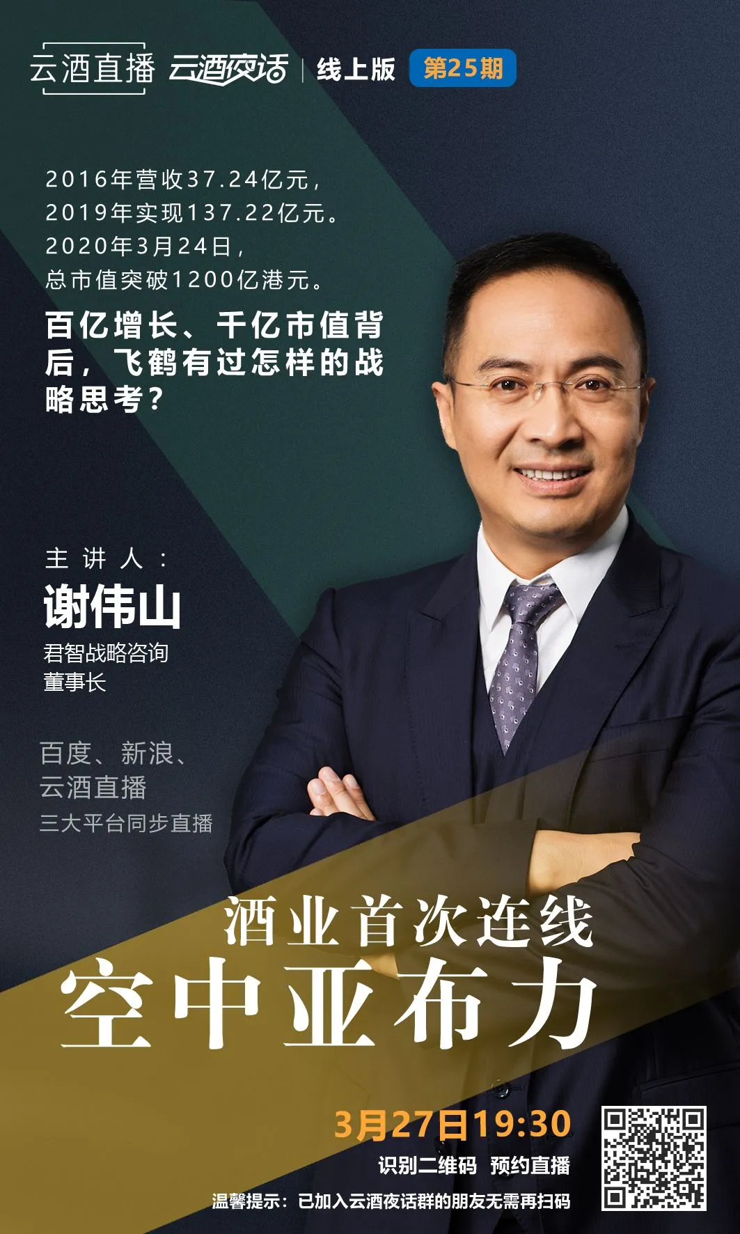 第25期云酒直播将在酒行业首次连线“空中亚布力”,中国飞鹤的长期战略顾问——君智战略咨询董事长谢伟山作为主讲人,将在现场解读《中国飞鹤破局千亿之道》。