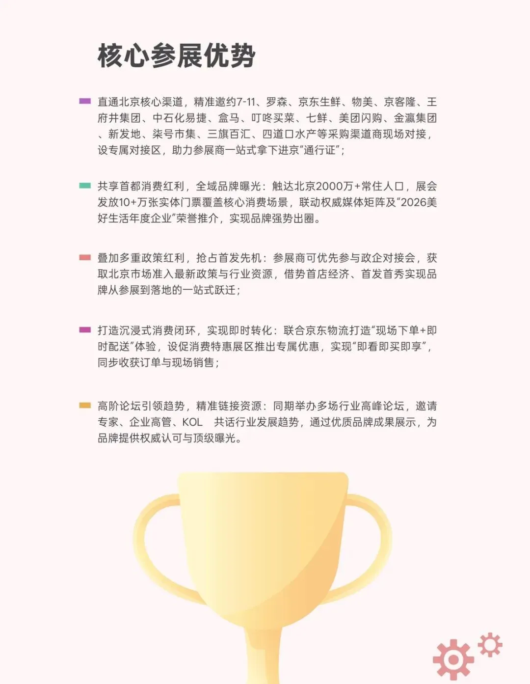 展会紧扣国家扩内需、促消费战略,深化北京 “会展+消费” 融合发展,全力拓宽优质商品进京通道,助力企业高效链接全国核心渠道资源。现诚邀各零售品牌、特色供应商、生鲜企业、数字零售及AI商业机器人等相关企业踊跃参展参会,相聚首都北京,共探行业新机,共筑零售新生态!
