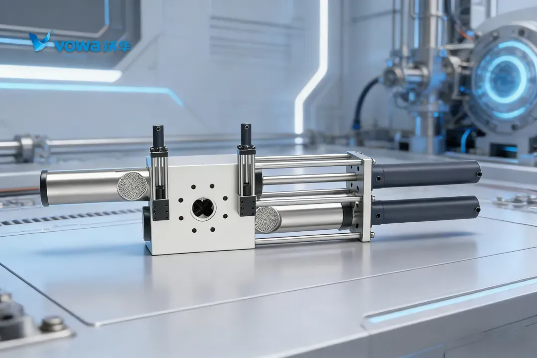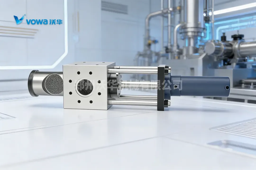 与熔体齿轮泵协同:构建“稳压系统”:这是高端生产线的黄金组合。熔体齿轮泵的核心作用是精确计量和稳定输出。当它安装在换网器下游时,可以有效隔离上游因换网、喂料波动带来的压力扰动,为模头提供绝对稳定的压力。反之,换网器保护齿轮泵免受硬质杂质损伤。沃华熔体齿轮泵与换网器的配套设计,正是基于这种深度协同逻辑。
