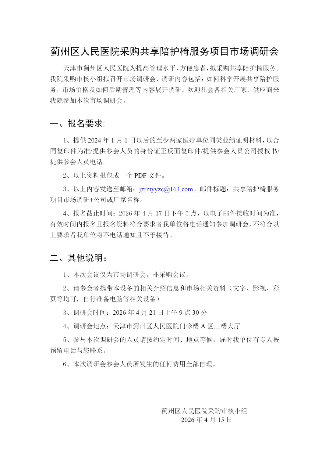 关于蓟州区人民医院采购共享陪护椅服务项目市场调研会的公告