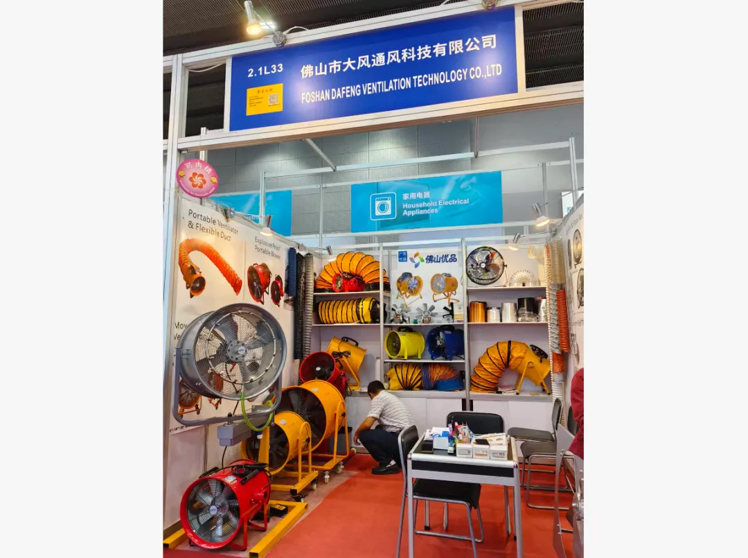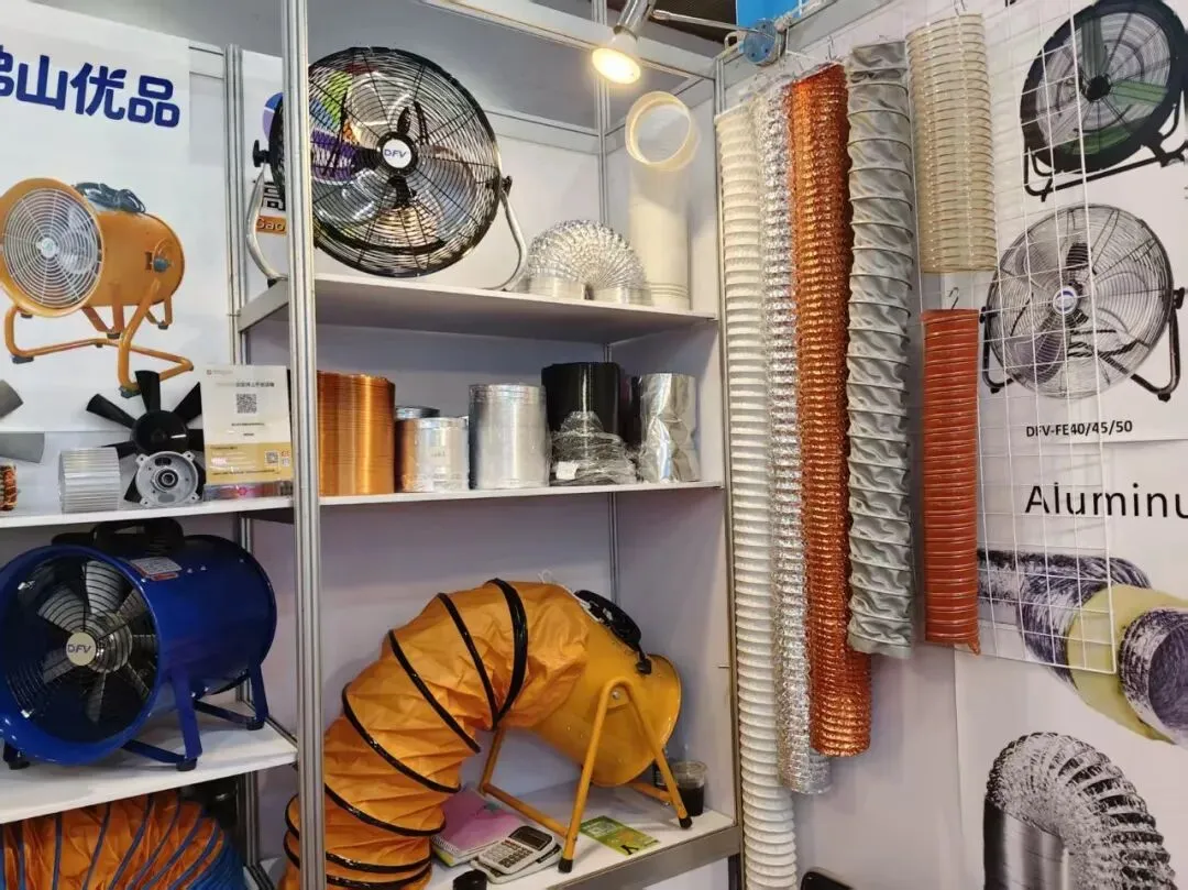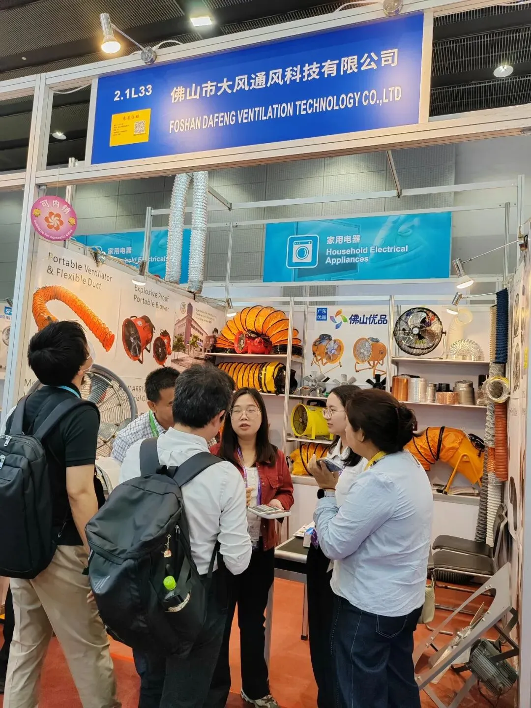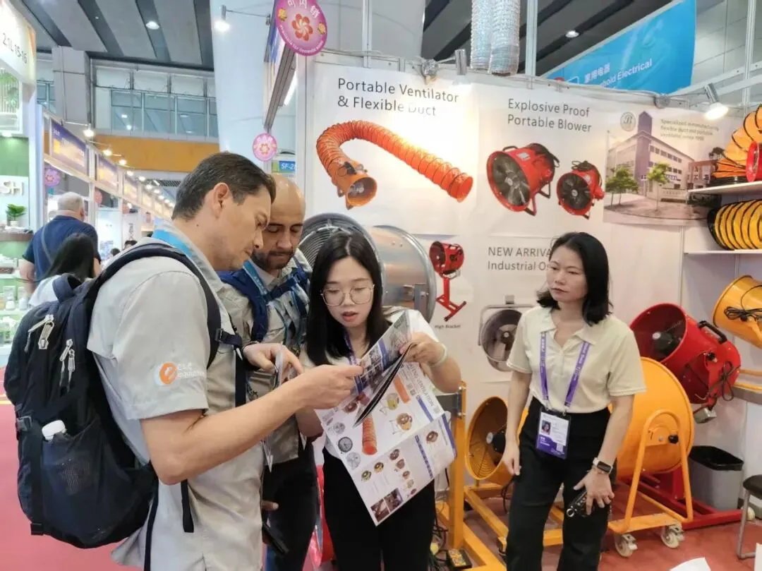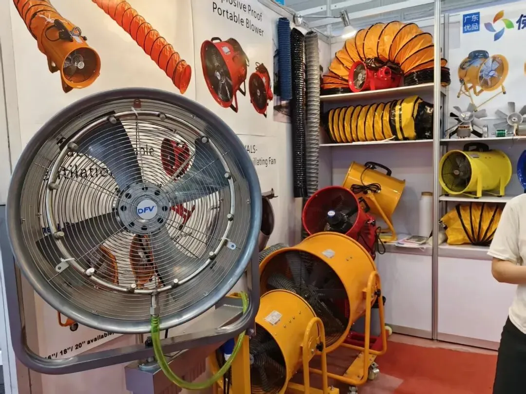 开展首日,我司展位吸引了众多国内外采购商驻足咨询,新老朋友纷纷到访。现场主要展出了手提式轴流风机、移动风机、防爆风机、壁扇、趴地扇、工业排气扇及各类配套风管。