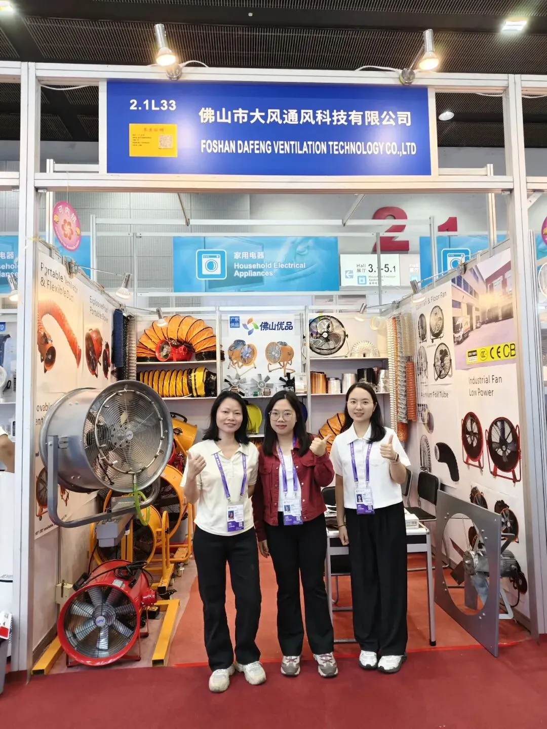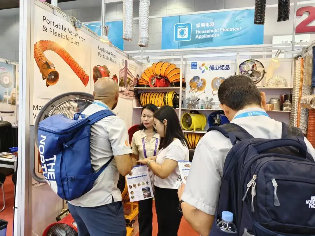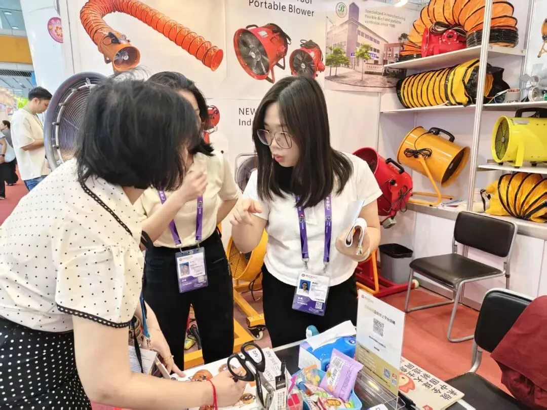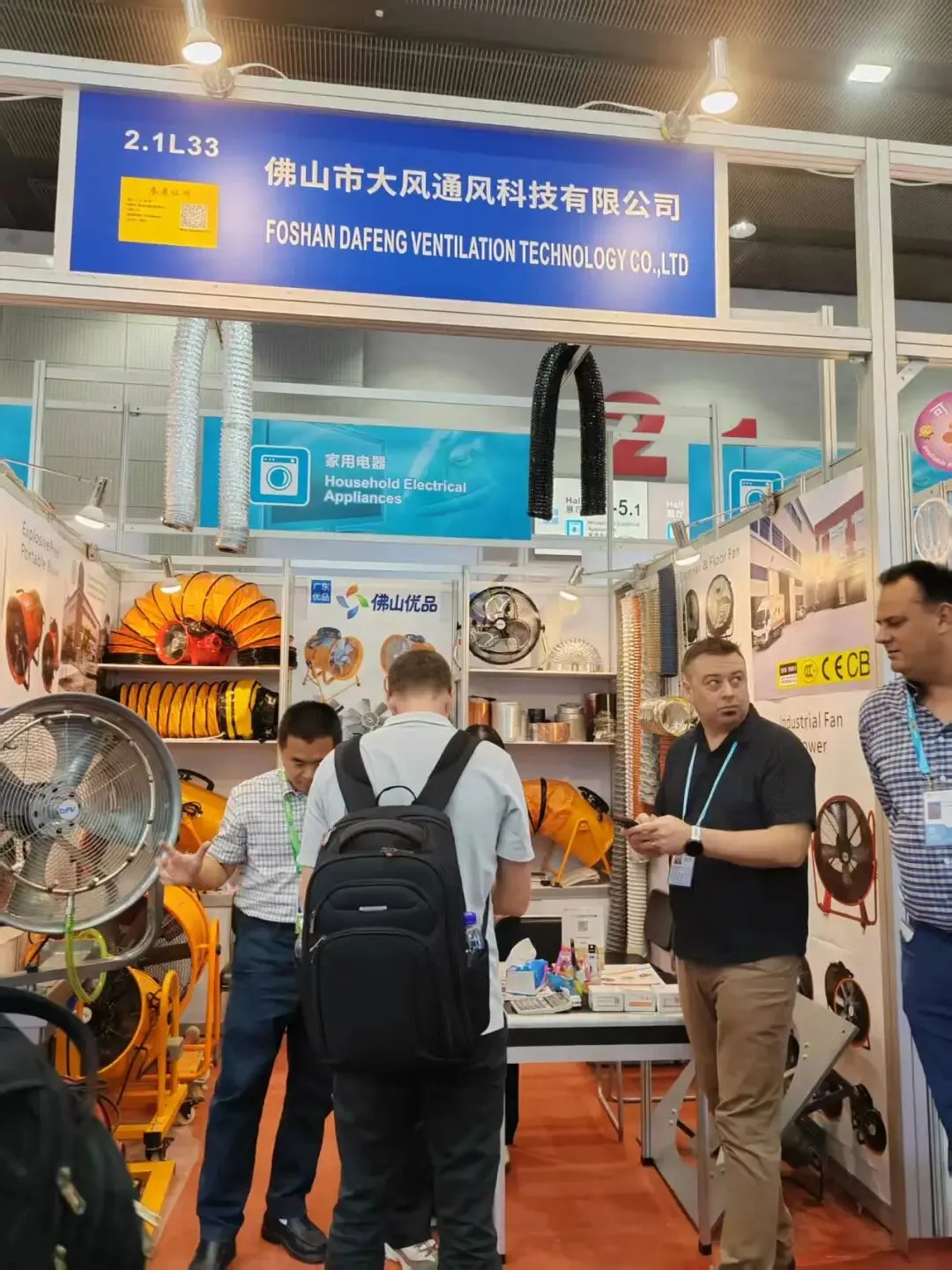 开展首日,我司展位吸引了众多国内外采购商驻足咨询,新老朋友纷纷到访。现场主要展出了手提式轴流风机、移动风机、防爆风机、壁扇、趴地扇、工业排气扇及各类配套风管。