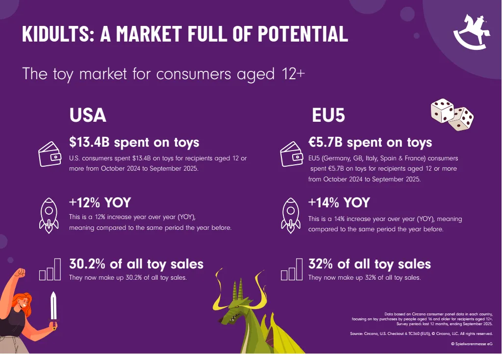 展会将延续2026年的成功经验,重点聚焦两大趋势主题:AI玩具与大童经济(Kidults) 。在2026年展会中,“AI爱玩”和“创造性正念”两大趋势引发了全场关注,人工智能在玩具领域的应用成为最热门话题。与此同时,大童玩具专区人气爆棚——根据Circana数据,美国12岁以上玩具消费规模已达134亿美元,欧洲市场也达到57亿欧元。“玩具不再只是给孩子”已成为行业共识,可收藏类玩具、桌游、盲盒、潮玩毛绒等品类成为买家停留时间最长的区域。