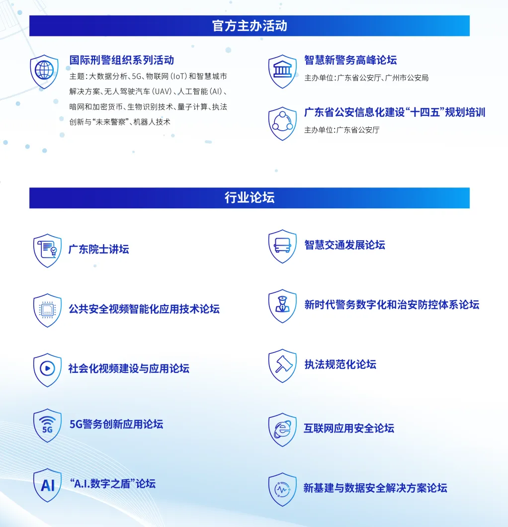 安博会期间,广东省公安厅将同期主办智慧新警务高峰论坛和广东公安信息化建设“十四五”规划培训,邀请专家学者,公安部及全国、全省各级公安机关领导,省政府及相关职能部门领导参加;主办方将联合国际刑警组织举办线上技术沙龙;联合广东省科学技术协会举办院士讲坛;联合中国安全防范产品行业协会、广东省网络空间安全协会、公安部一所、中山大学、华为、阿里云、中国移动、中国电信等行业协会、科研机构和高科技企业,举办人工智能、大数据智能化、网络安全、执法规范化、智慧交通、视频建设与应用、5G警务创新应用等20余场顶尖创新峰会与行业论坛,为安防行业提供一个专业、高效、国际化的交流展示平台,全力打造一场“立足华南、着眼国内、辐射国际”的专业安防品牌盛会。