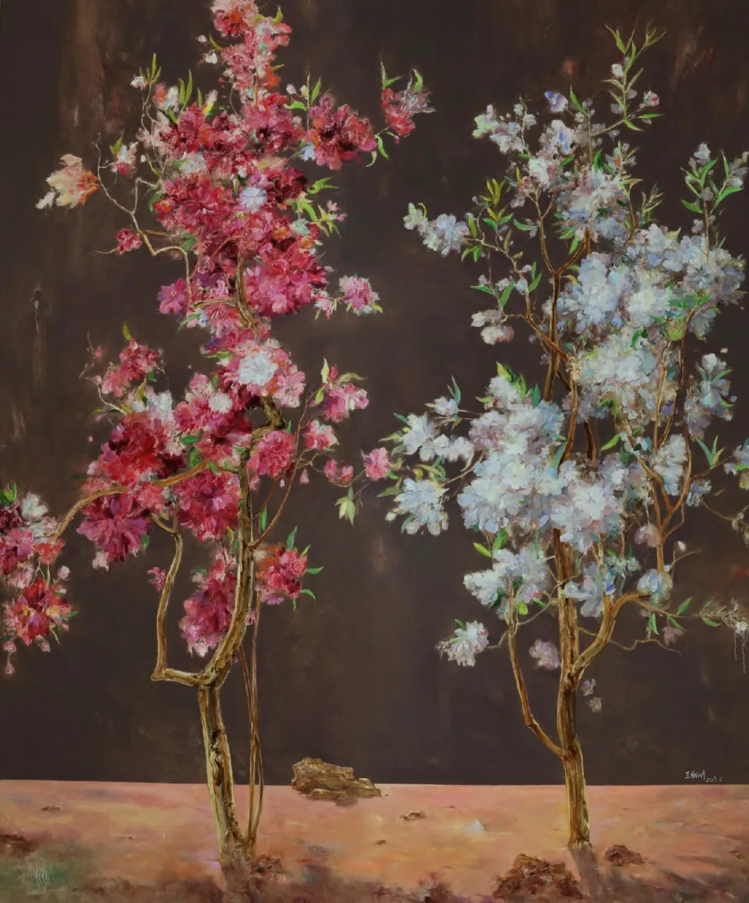 王朝刚的此次个展,远非三个创作主题或系列作品的简单罗列与物理性陈列,而是一次精心编排的充满内在韵律语调与哲学暗示的视觉叙事,一次从微观生命的深邃凝视与存在叩问(花),穿越物质景观、现世隐喻与文明悖论的沉思长廊(果),最终抵达浩瀚精神境域、心象彼岸与宁静归宿(山)的完整的螺旋上升且具有启示性的精神旅程。