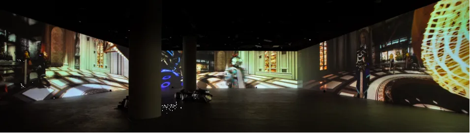 《神动迷踪》里,答案藏在一个词里:动作。这是一座由多屏投影构成的“时间迷宫”。九位自主智能体,在同一空间的不同时间层里巡游。它们没有台词,没有表情,只有持续的移动:靠近与拉开,成群与落单,停顿与转向。现场没有辩论,只有沉默的投票。