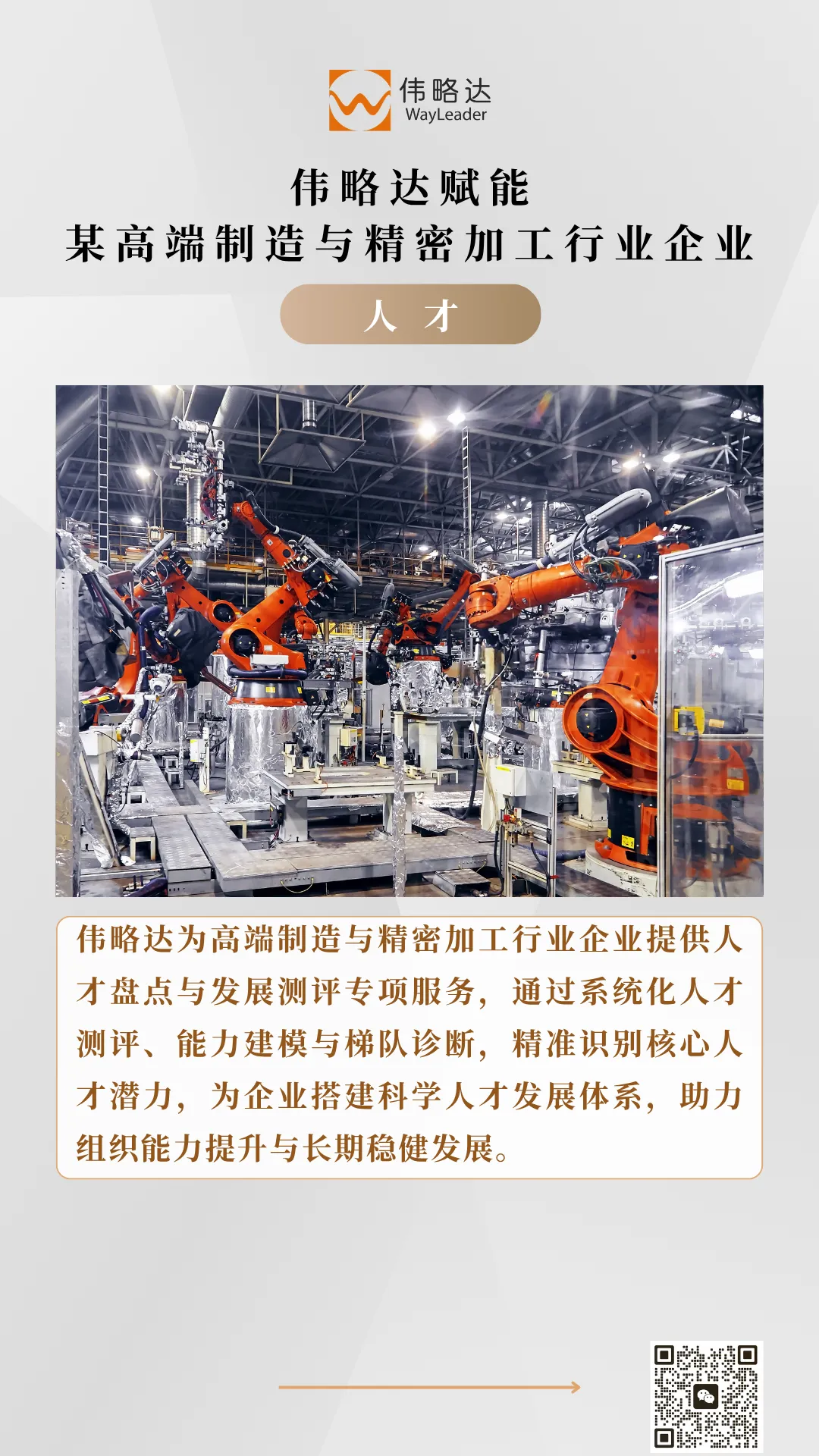 伟略达为高端制造与精密加工行业企业提供人才盘点与发展测评专项服务,通过系统化人才测评、能力建模与梯队诊断,精准识别核心人才潜力,为企业搭建科学人才发展体系,助力组织能力提升与长期稳健发展。