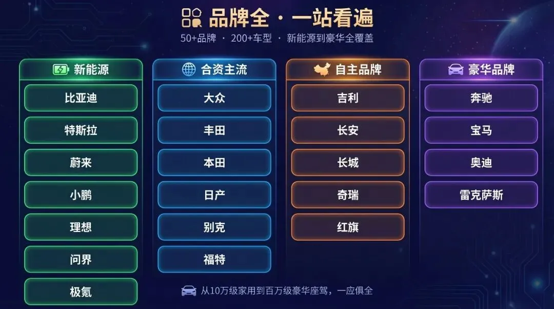 | | 从10万级家用代步到百万级豪华座驾新能源/合资/自主/豪华全覆盖 |