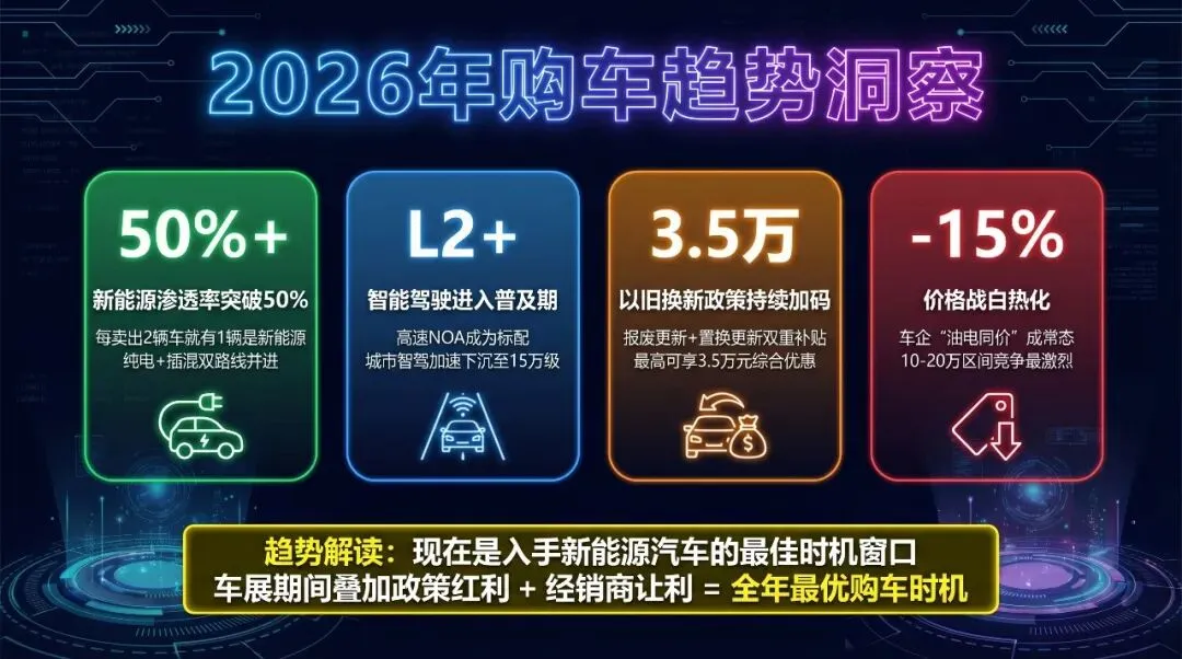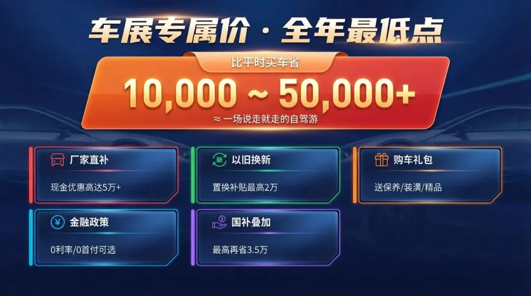 | | | 购置税减半 + 国补最高2万 + 置换补贴 + 地方消费券 = 全年最优时机 |
