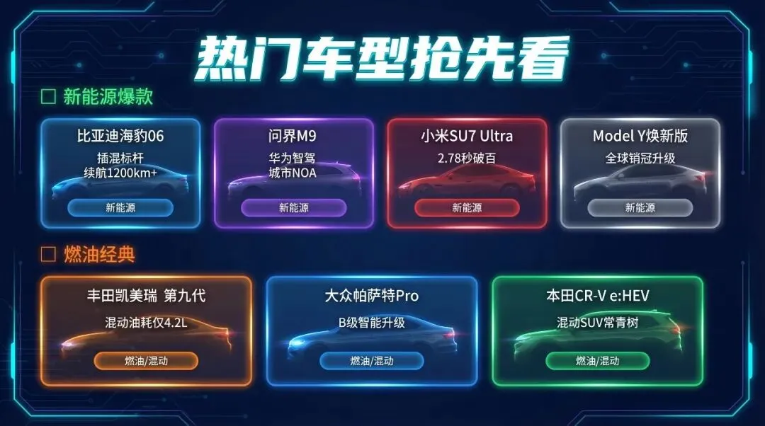 | ? 新能源爆款 • 比亚迪海豹06 — 插混轿车新标杆,续航1200km+• 问界M9 — 华为智驾旗舰SUV,城市NOA全覆盖• 小米SU7 Ultra — 性能纯电轿跑,2.78秒破百• 特斯拉Model Y焕新版 — 全球销冠再升级 |