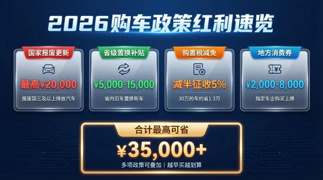 ? 买车还在等什么?这波福利别错过!2026年购车政策密集落地:购置税减半 + 以旧换新补贴最高3.5万 + 购车消费券叠加——堪称近年来"买车最划算"的时间窗口。 |