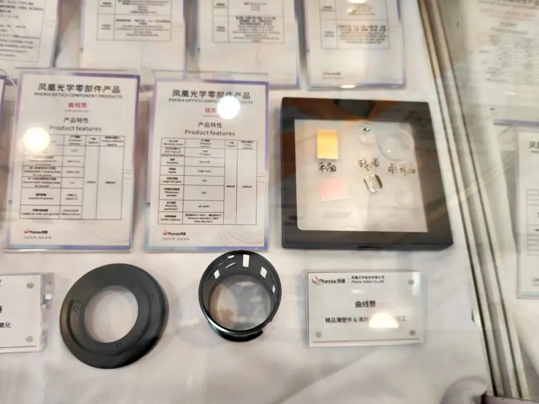 本次展会,凤凰光学展示了覆盖全品类的精密光学镜片。球面镜加工范围毫米级至百毫米级,偏芯精度≤15″,支持多枚粘合、D-cut、涂墨及AR/HR等多功能镀膜。平面镜面型精度PV≤λ/10,表面粗糙度达纳米级,可实现倒边、开孔等异形加工。非球面镜面间偏芯≤3μm,支持双面非球面及硫系玻璃加工。