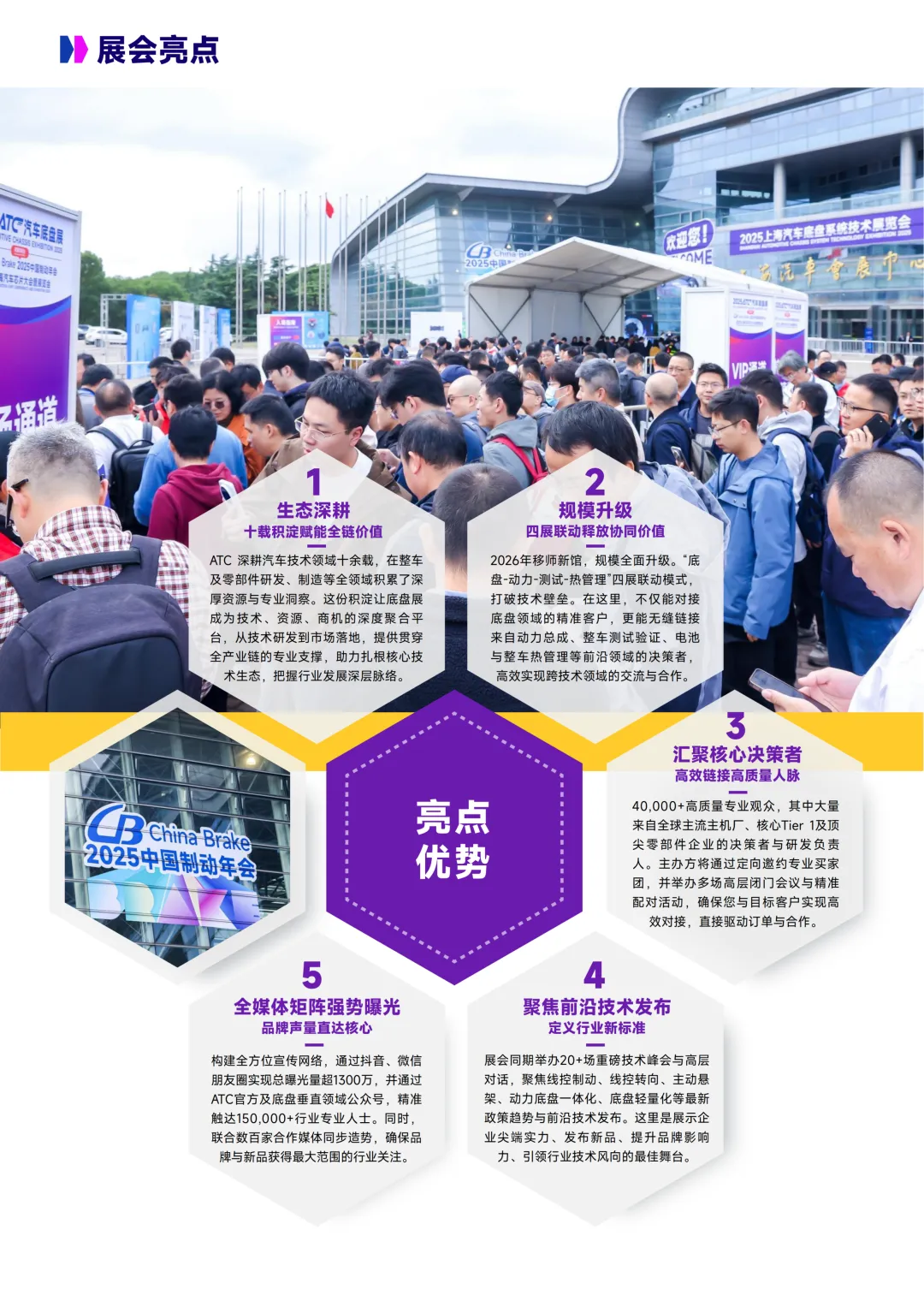 2026 年 6 月 3-5 日,上海国际汽车底盘系统技术展览会将于上海新国际博览中心举办。作为亚洲极具专业性的汽车底盘系统展示交流平台,展会以 “展览 + 技术峰会” 双核驱动,构建覆盖研发、制造、配套、采购的全产业链生态。展会展出面积超 40,000㎡,汇聚全球 600 + 底盘领域标杆企业,预计吸引超 40,000 名专业观众,其中主机厂及 Tier1 采购、技术决策层占比超 35%,并联动动力、测试、热管理主题展会,实现跨领域资源互通与技术融合。参展企业可直面 73% 整车厂商、62% Tier1 总成企业及行业机构核心决策人群,高效完成意向客户对接;依托制动、悬架、转向、智能底盘、智能制造五大主题展区,系统化展示前沿技术与核心产品,获得行业专家与主机厂的专业验证与认可;同期 7 大行业技术峰会、200 + 热点议题深度解读产业趋势,为企业技术布局提供权威参考;通过全媒体矩阵覆盖超 15 万行业专业人群,实现品牌声量与行业影响力同步提升;参与采购配对、专属商务交流等特色活动,进一步深化合作对接效率。优质展位分布于展馆主通行廊道及主题展区核心节点,直面专业观众主流动线,是主机厂采购团队、行业专家及媒体参观考察的必经区域,能够最大化提升品牌曝光频次与意向客户驻足交流概率,为技术展示、商务洽谈创造更优场景条件。若企业正规划技术展示、客户拓展或品牌升级,可免费获取 2026 展会定制化展位布局方案、往届参展客户画像及行业数据报告,同步了解同期峰会参与及商务活动对接细则。无需即刻决策,仅需沟通即可获取完整参考资料,为企业参展决策提供专业、客观的支撑。关注本公众号,持续获取 2026 上海国际汽车底盘系统技术展览会最新进展、行业技术深度解析及展商前瞻动态。欢迎在评论区留言 “底盘展 + 企业名称”,将有专业人员为您提供一对一咨询服务。