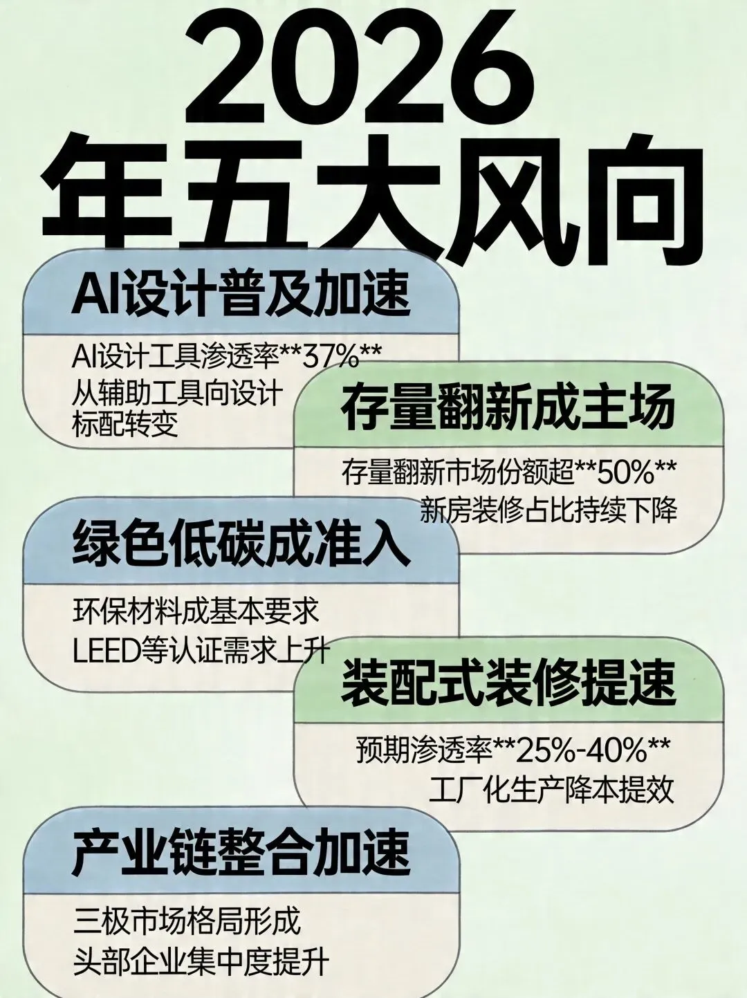 第三,2026年的五大风向已经明确:AI设计普及、存量翻新主导、绿色低碳准入、装配式提速、产业链整合。