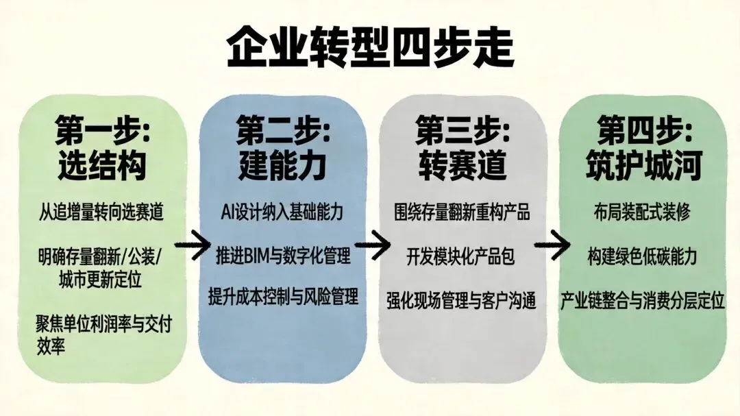建议: - 将重心由新房整装逐步转向二手房翻新、旧房改造、适老化改造、局部更新、城市更新配套等领域 - 针对存量市场的特点,开发模块化产品包、快速翻新方案、分阶段施工服务 - 强化现场管理与客户沟通能力
