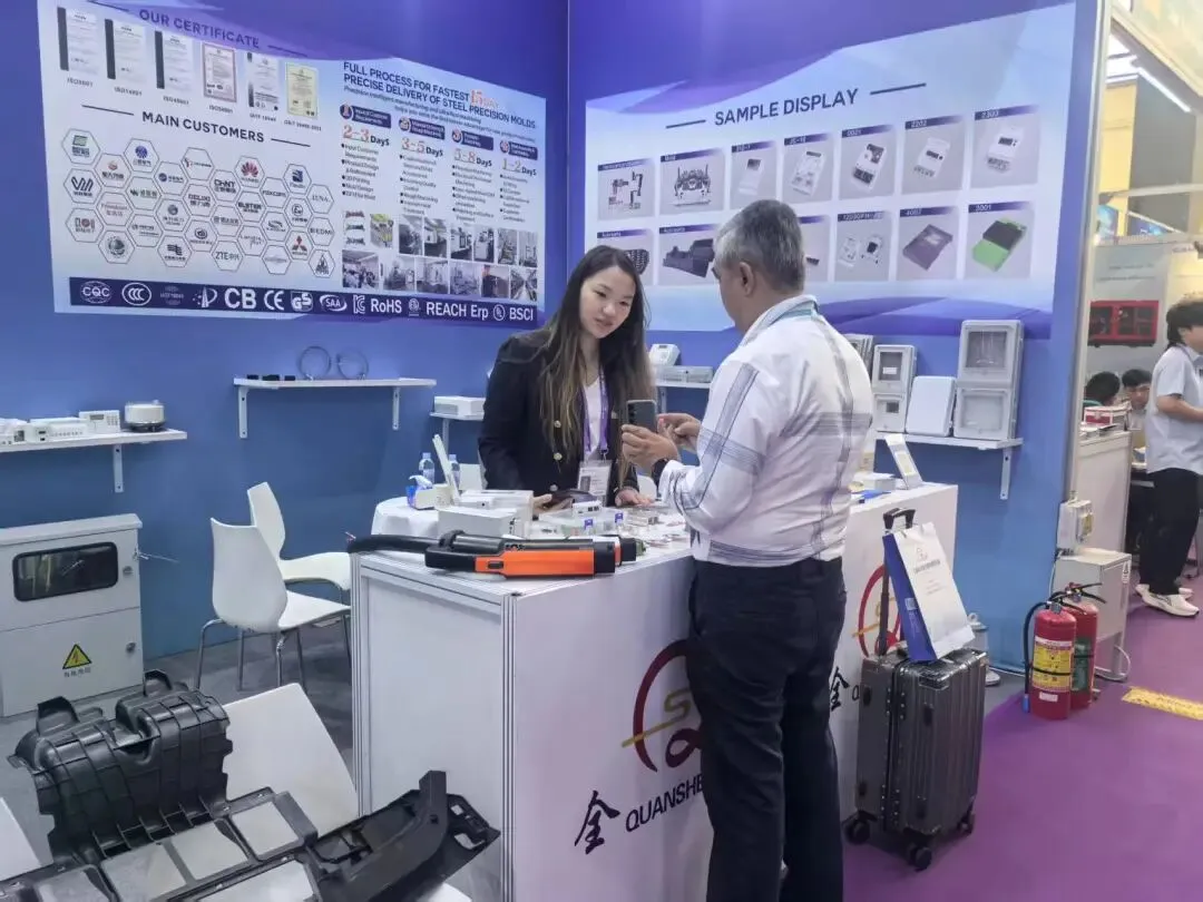 此次广交会出现了不少前湾新面孔,全盛壳体便是其中一家。“只要产品具备核心技术竞争力和质量保证,市场机遇自然会来。”企业负责人袁可濛的话语中透着底气。作为专注电力仪器仪表结构组件、计量箱及低压成套设备的研发制造企业,近年品牌建设与外贸增长显著,印证了“双循环”与“国内国际协同发展”战略。展会期间,全盛壳体重磅推出自主研发的热带海岛专用非金属电能计量表箱,并入选新品首发。该产品采用高分子复合材料改性工艺,抗紫外线、防潮防腐达IP68,增强结构可抵御12级台风及盐雾腐蚀,适配极端工况,并针对东南亚、中东市场改良,已在海南多地实测。首次参展,其多样化海外表计、表箱便吸引俄罗斯、沙特、印度、土耳其等国家地区采购商洽谈,助力拓展海外市场。