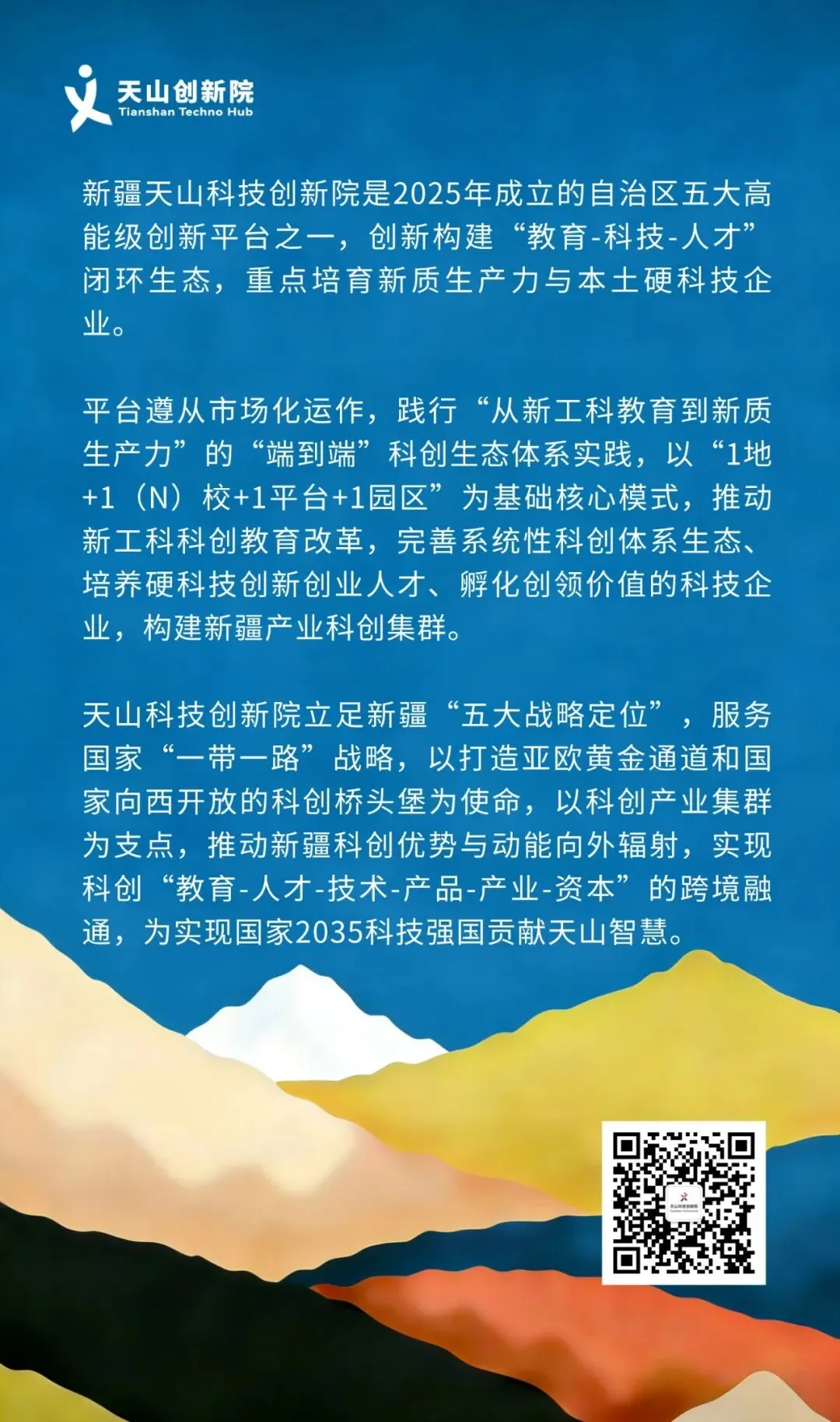 新疆天山科技创新院(以下简称天山创新院)作为自治区五大高能级创新平台之一,立足新疆“五大战略定位”,服务国家“一带一路”建设,以探索新工科教育路径;汇聚创新潜力人才;构建新疆科创新生态为使命,以“向新而行,科创让新疆更美好”为愿景,构建“教育-科技-人才”闭环生态,成为服务国家战略、培育新质生产力的核心引擎。