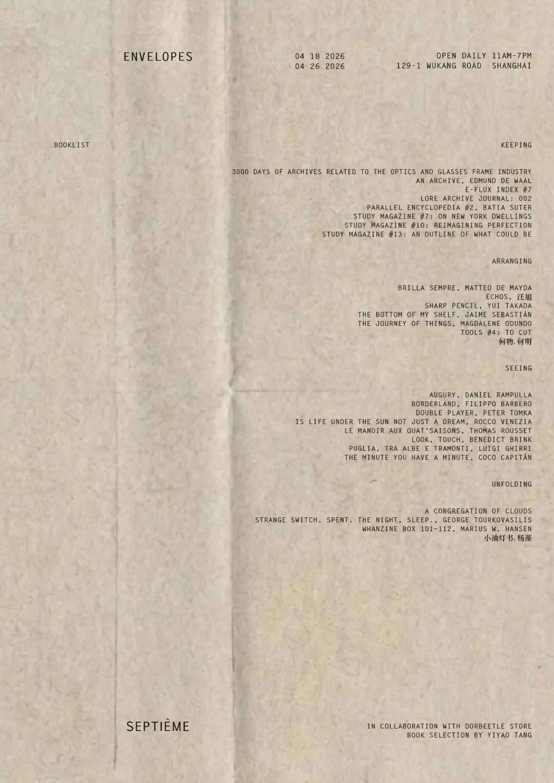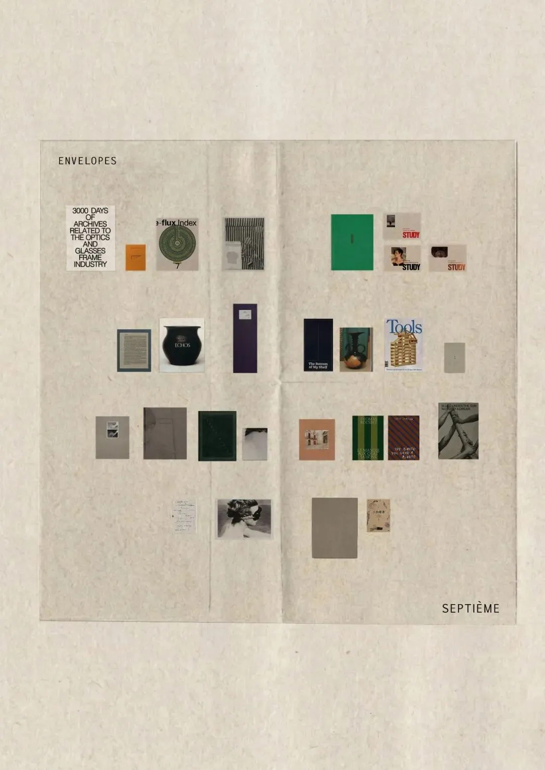 在这期“envelopes”中,有七年收集眼镜行业的档案,有每日清洁的角落图像,有书架底层从没被认真看过的书脊,有很多支削好的铅笔,有一百二十四则小故事,有人重返自己长大的地方,发现它正在消失和生长。
