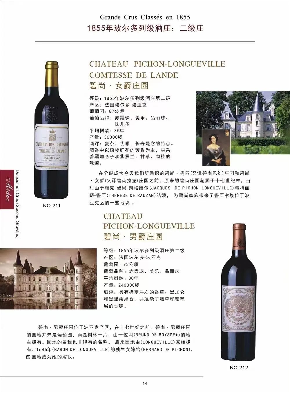 “碧尚女爵酒庄和碧尚男爵酒庄”这两个酒庄都是二级庄,曾经都属于碧尚家族的产业,但2007年AXA收购了碧尚男爵酒庄。