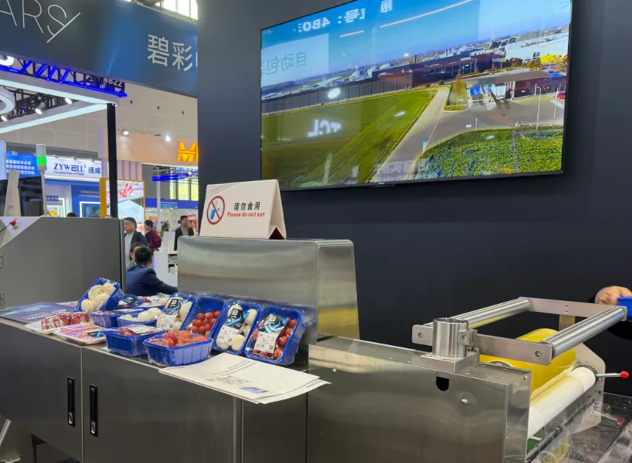 BIZERBR工业部生鲜产品行业销售总监张强介绍:“我们的产品主打自动包装与AI识别功能,能够自动识别产品种类,并完成自动称重与贴标,广泛适用于超市配货中心及门店生鲜配送的自动化包装环节。相比过去人工操作效率较低的情况,这套设备可将包装速度提升至行业最快水平,达到每分钟200包。”