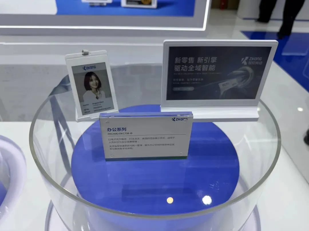 杭州智控网络有限公司国内销售部销售经理肖春雨说:“这是我们的一款新品——可翻页电子胸牌。它能够呈现员工的不同内容、档案及其他办公信息。我自己佩戴的就是本次参展设计的模板,上面还配有二维码,方便客户在各种场合添加微信进行联系。”