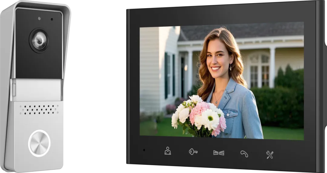 本届广交会重点参展产品有RL-7BAJ-AHD,这款可视对讲配备了高清摄像头与1080P显示屏,支持通话、对讲及实时监控功能。用户可远程控制打开电控锁与闸门锁,并设有免打扰模式。设备带有铭牌标识,采用四线或网线连接,安装灵活,适合住宅及办公场景使用。