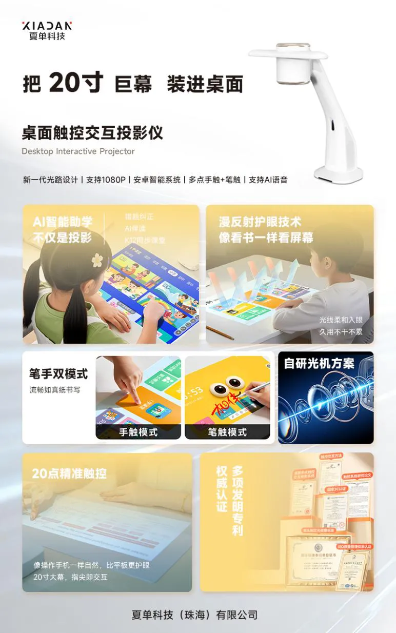 夏单科技新一代桌面触控交互投影仪,采用自研优化光路方案,具备20点以上多点手触及笔触双模式交互能力,触控精度达毫米级,适用于家庭教育、智能办公等场景。