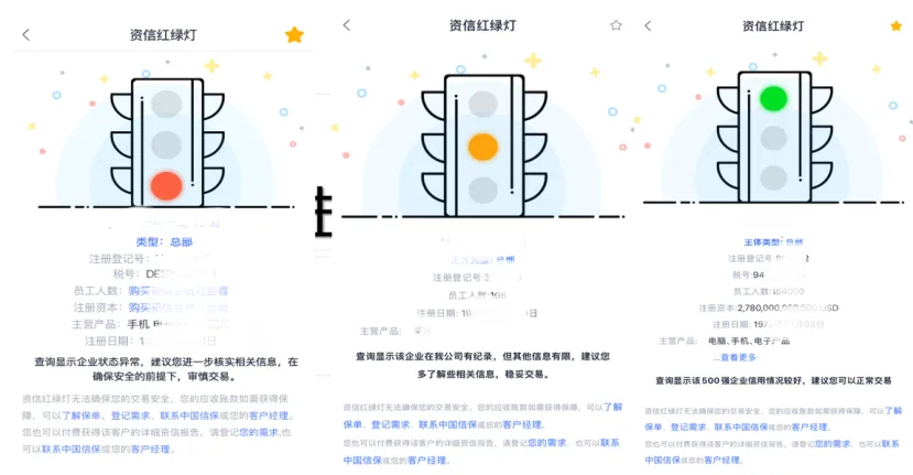 录入海外买方国别、企业名称后,后台通过“红绿灯模型”计算出亮灯结果,由此判断该买方的交易风险状况,帮助企业快速简便地识别海外买方/银行的信用风险。