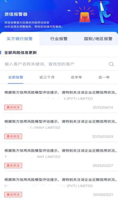 资信报警器就像车载雷达,360度扫描你的外贸环境,对潜在的政治风险、行业波动以及已合作买方的经营异常进行监控,一旦捕捉到风险信号,立刻发出警报。