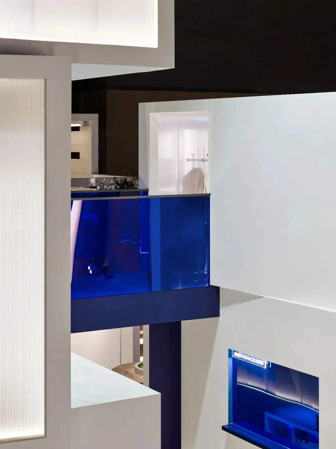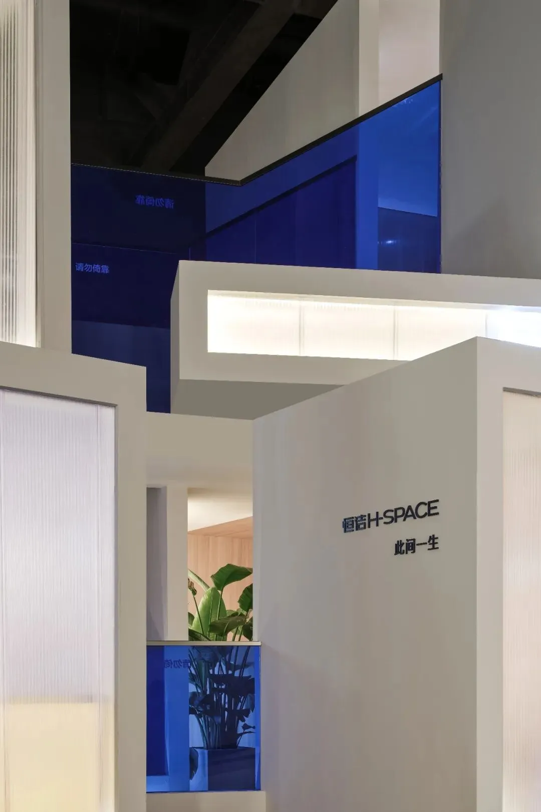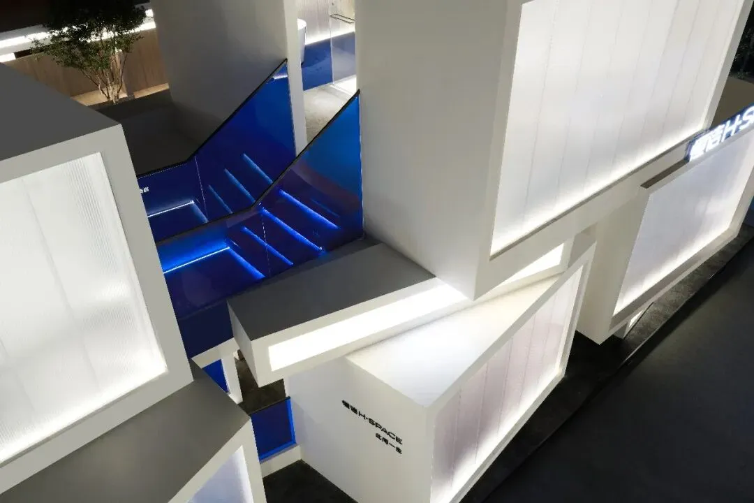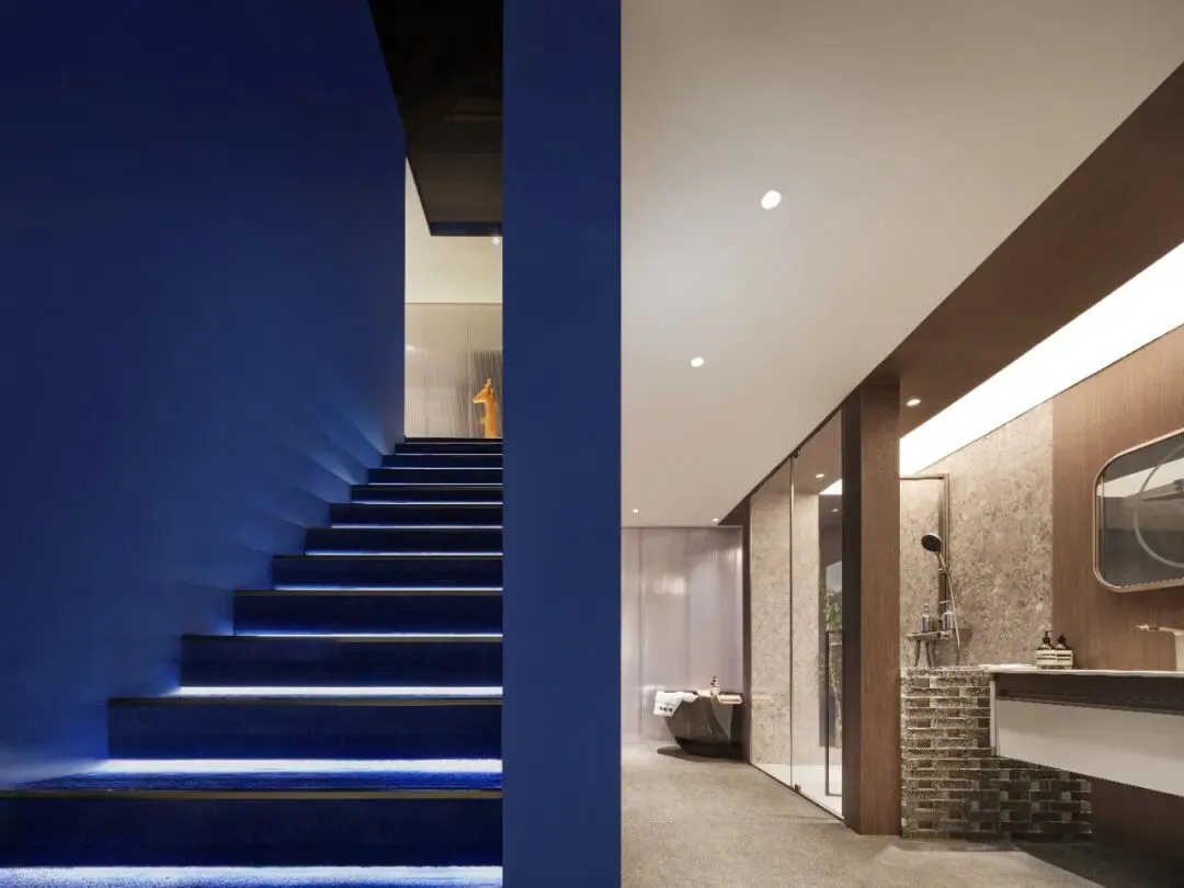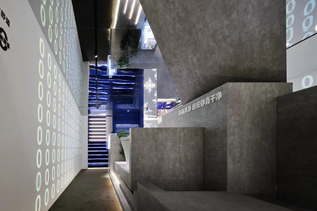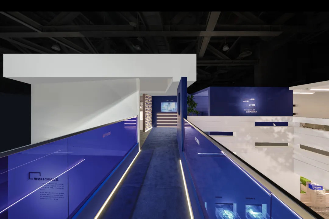 楼梯延续“恒洁蓝”引导线,如一段视觉旋律,串联叙事,也预示二楼更广阔的探索。