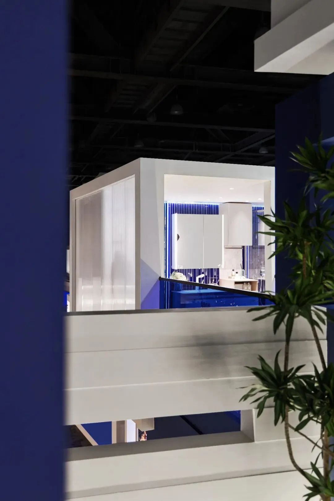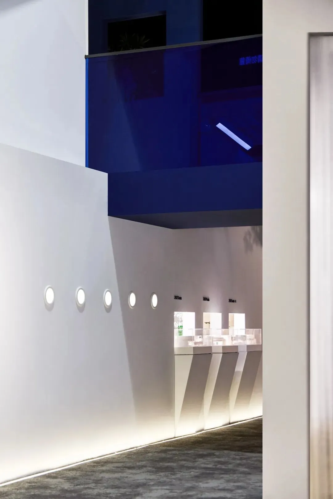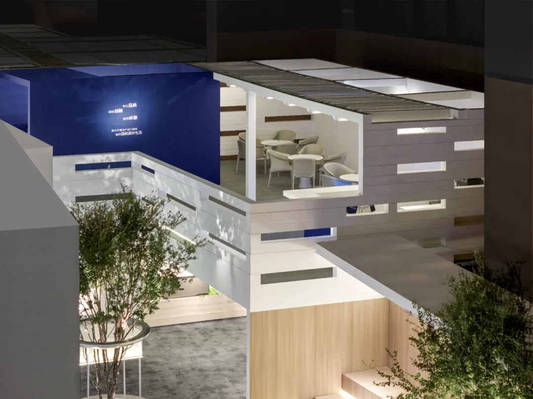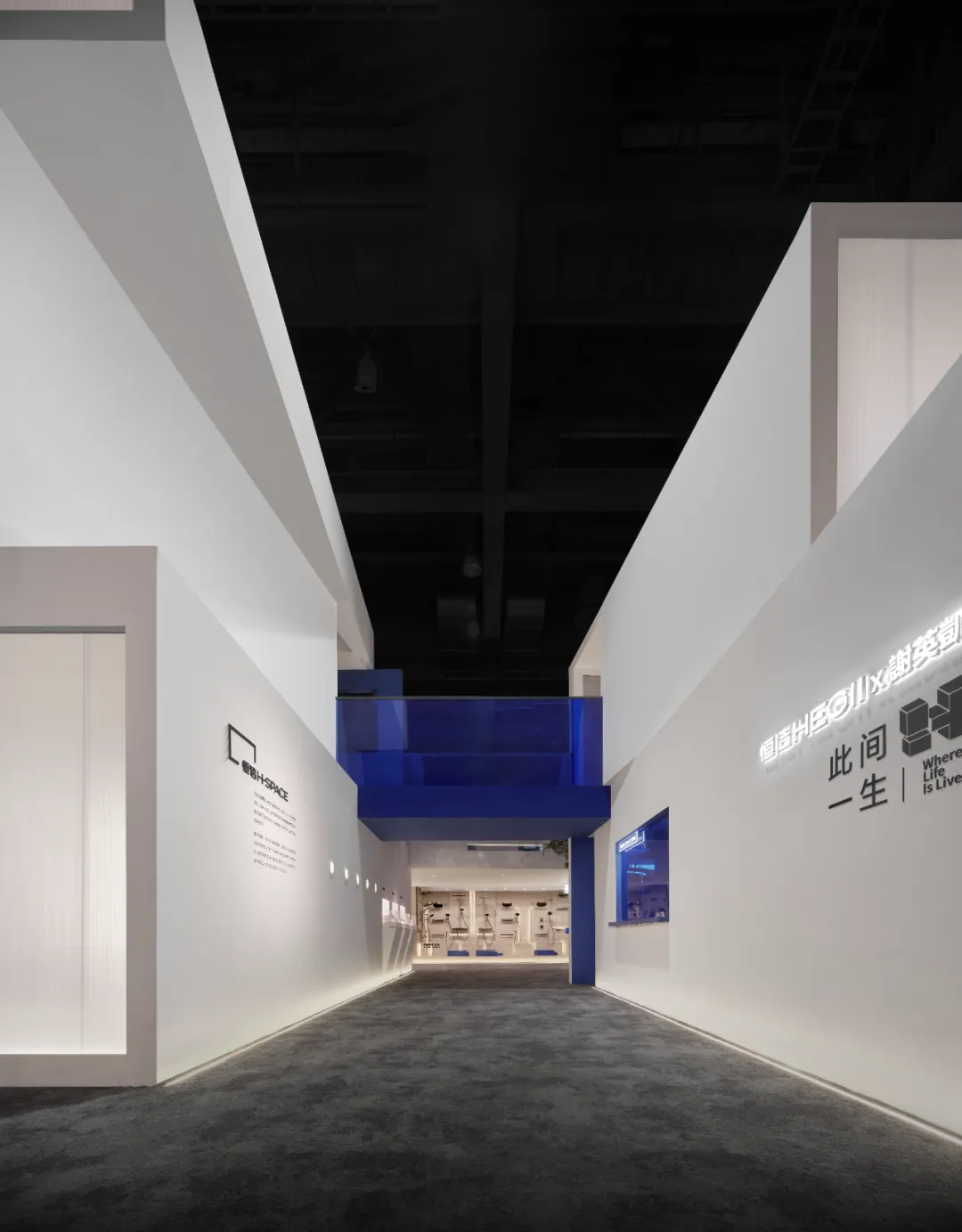 楼梯延续“恒洁蓝”引导线,如一段视觉旋律,串联叙事,也预示二楼更广阔的探索。