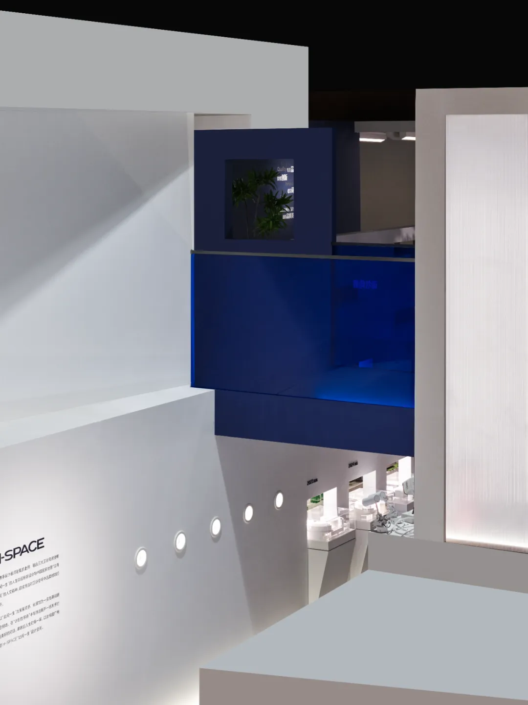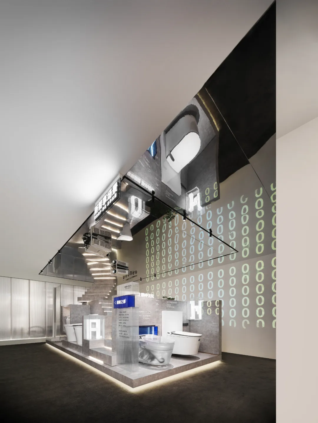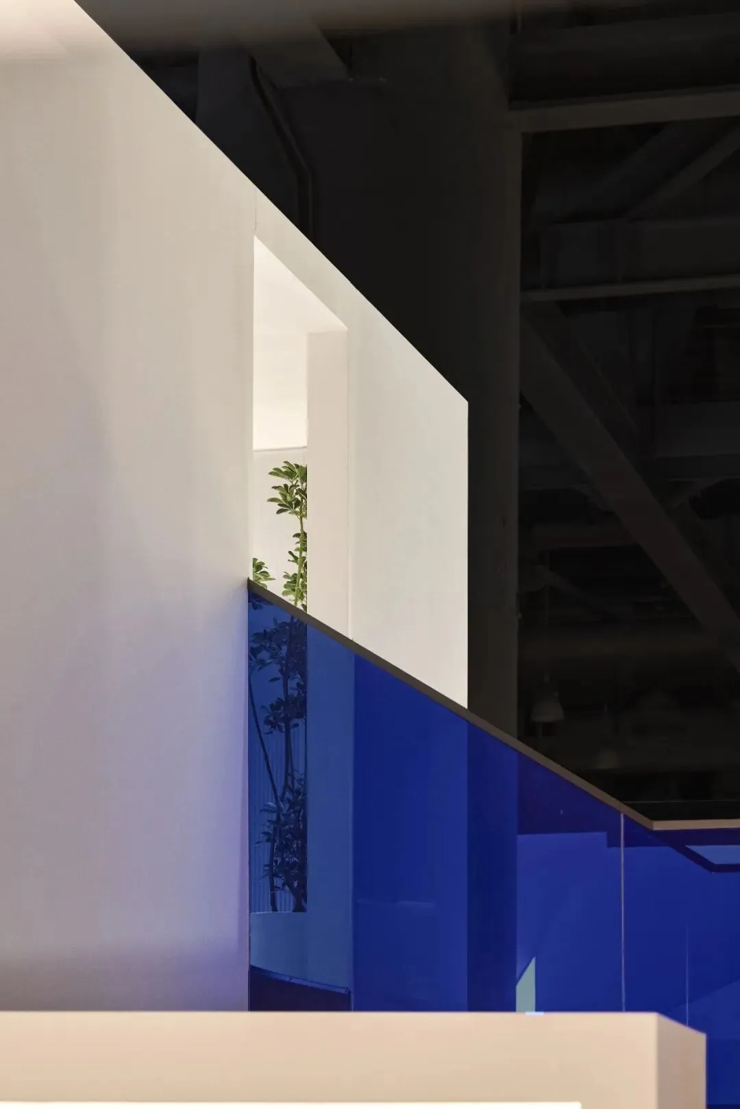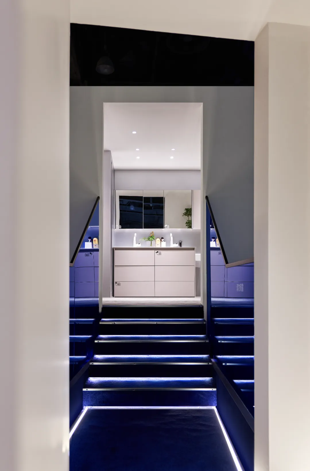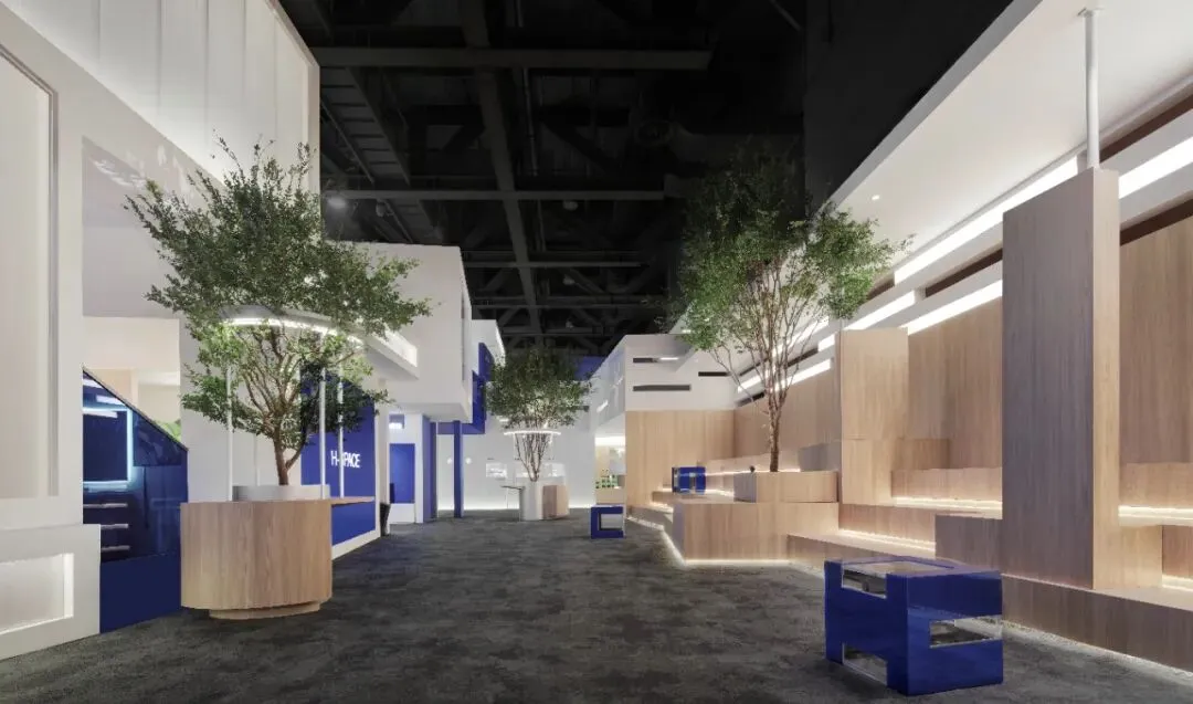 楼梯延续“恒洁蓝”引导线,如一段视觉旋律,串联叙事,也预示二楼更广阔的探索。