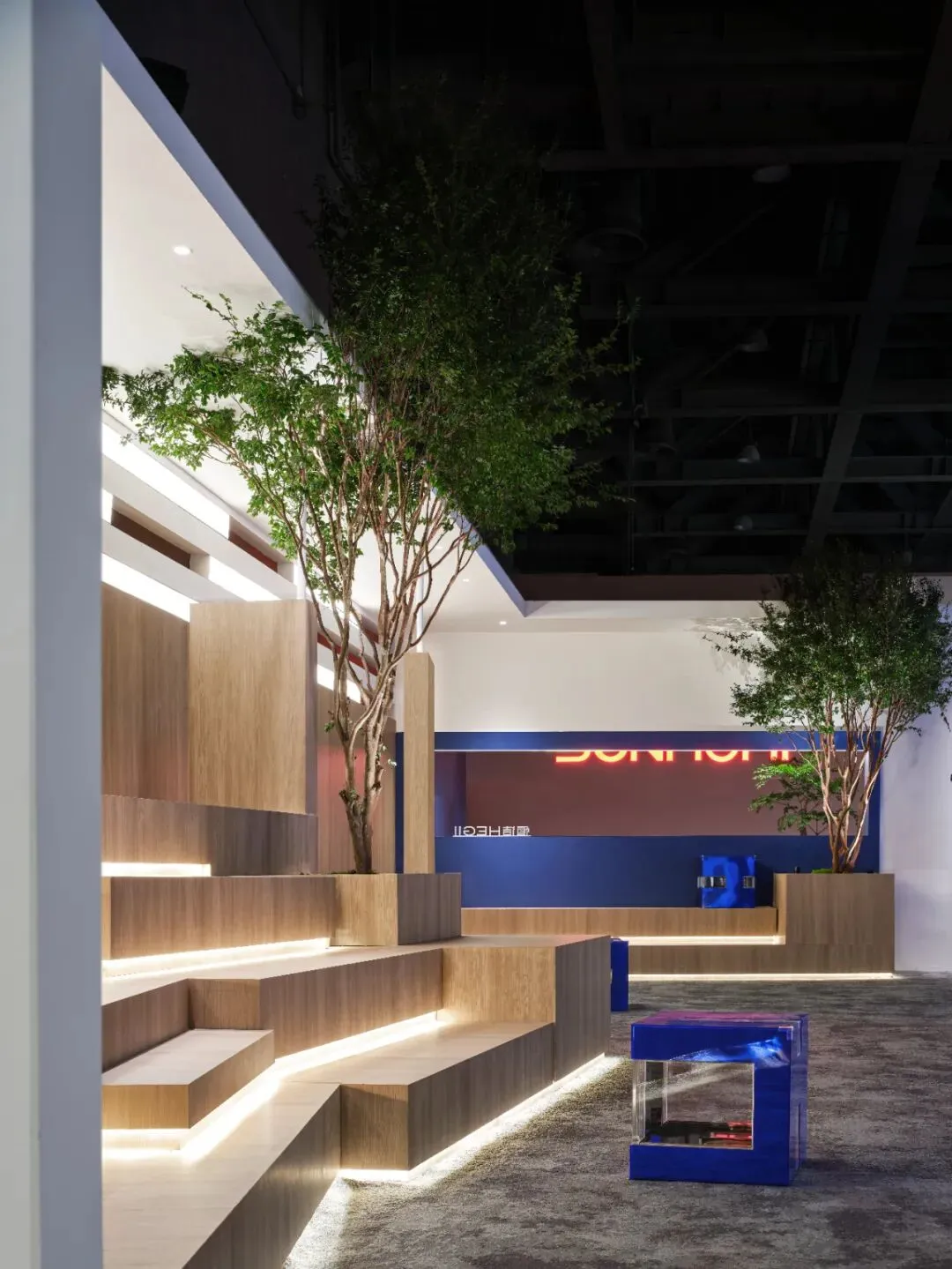 充满岁月肌理的木纹阶梯不仅提供坐席,更隐喻着人生的积累与沉淀;其面向的双面LED巨幕持续输出品牌故事,构筑包裹式的视听场域。