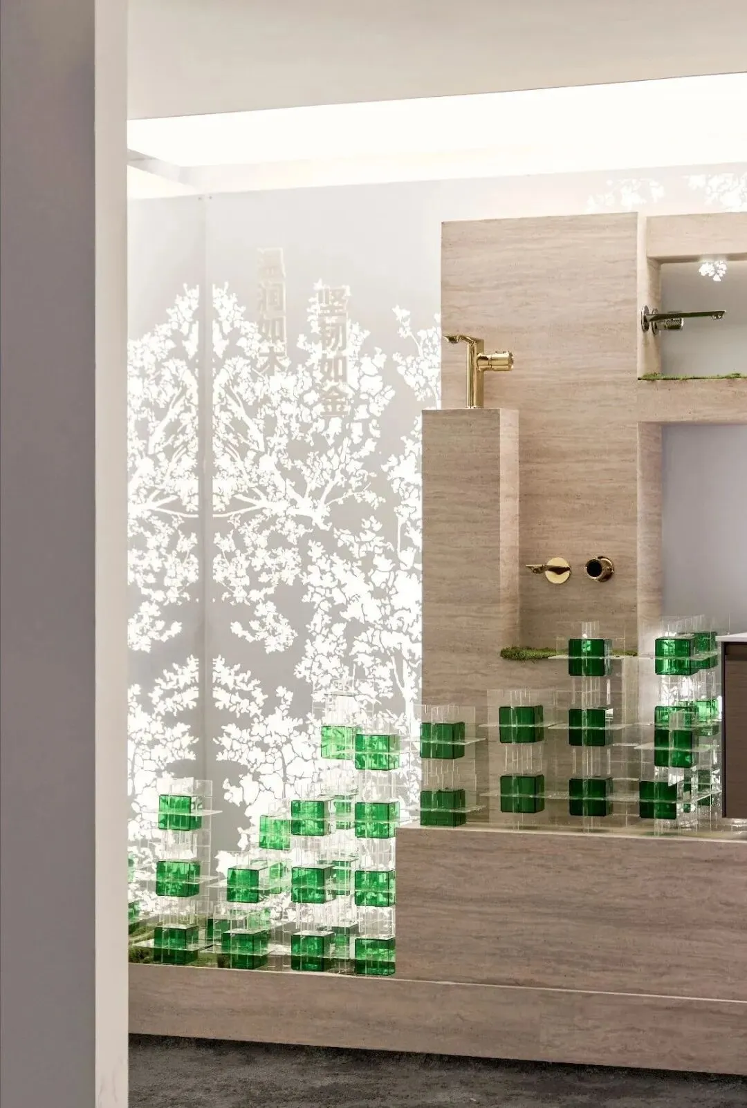 绿色透光材质层叠出光影斑驳的“热带雨林”,浴室柜在雾气中仍保持干爽,诠释着小空间的多功能集成与自然共生。