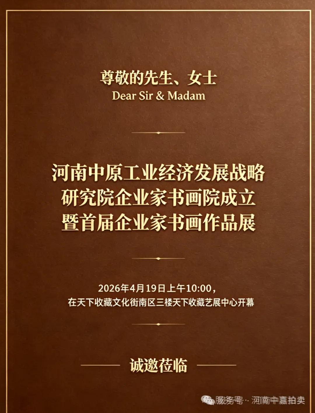 由河南中原工业经济发展战略研究院、河南省美术发展促进会主办,郑州天下收藏文化街协办的“河南中原工业经济发展战略研究院企业家书画院成立暨首届企业家书画作品展”,将于4 月 19 日在天下收藏文化街盛大启幕。